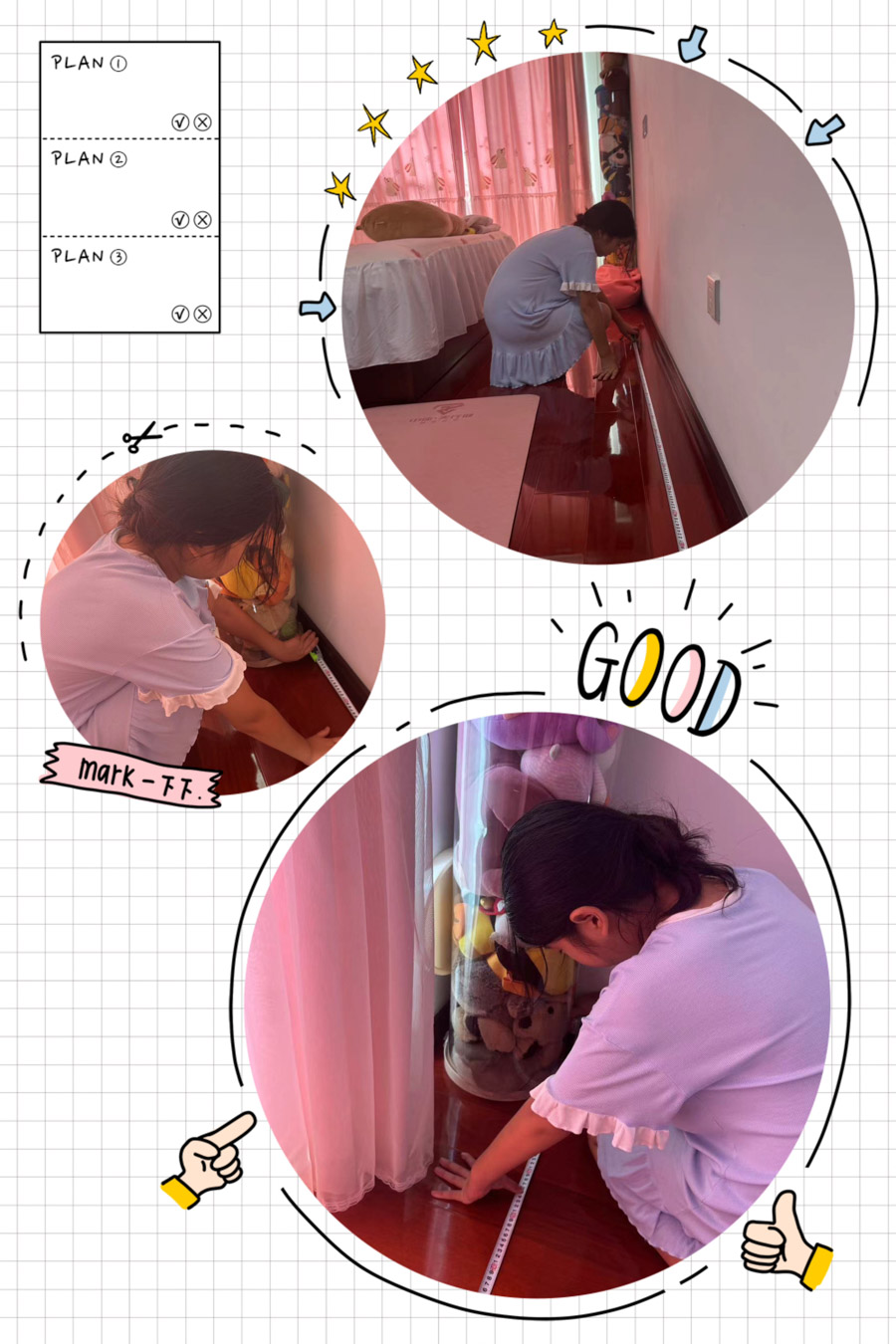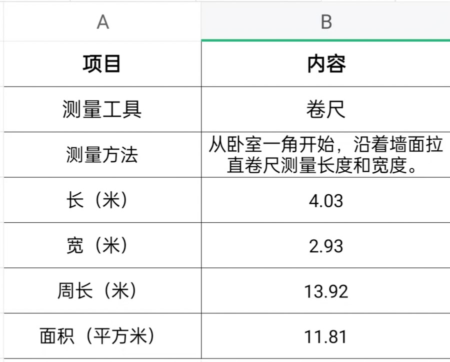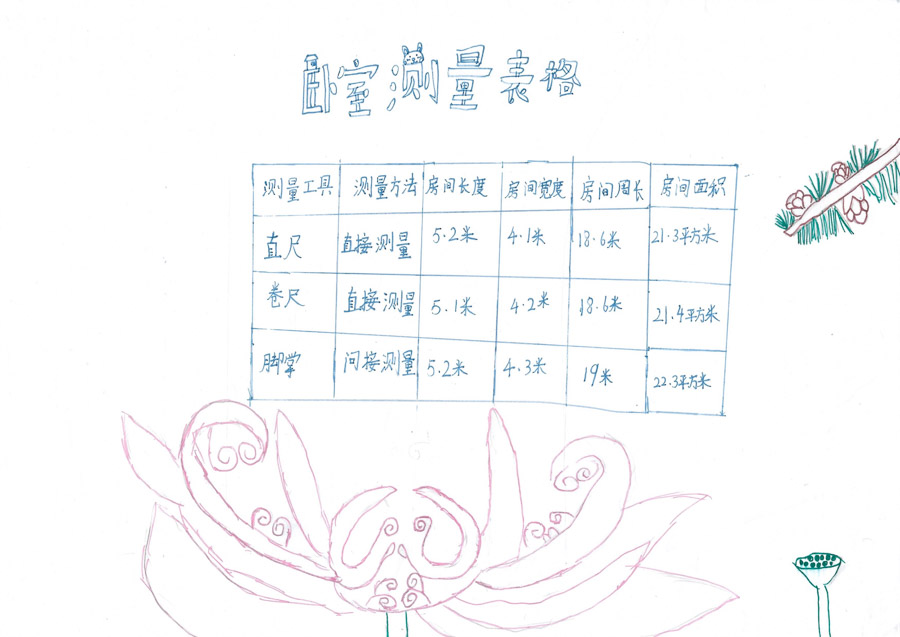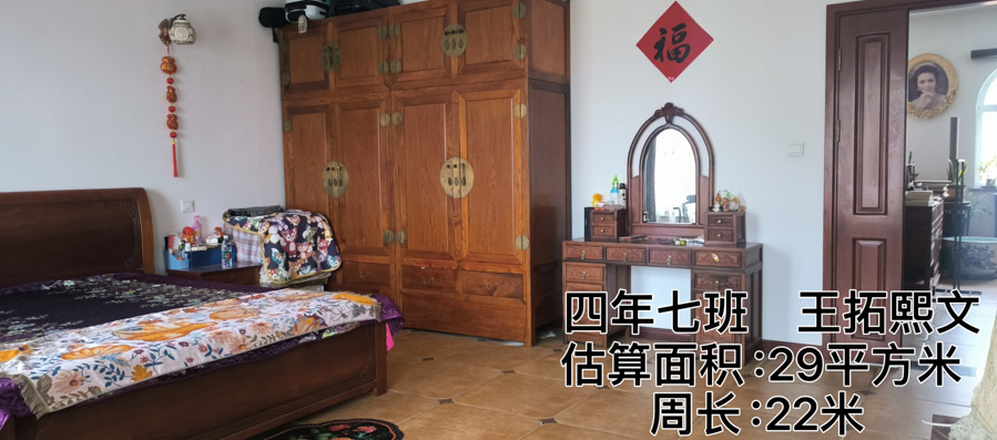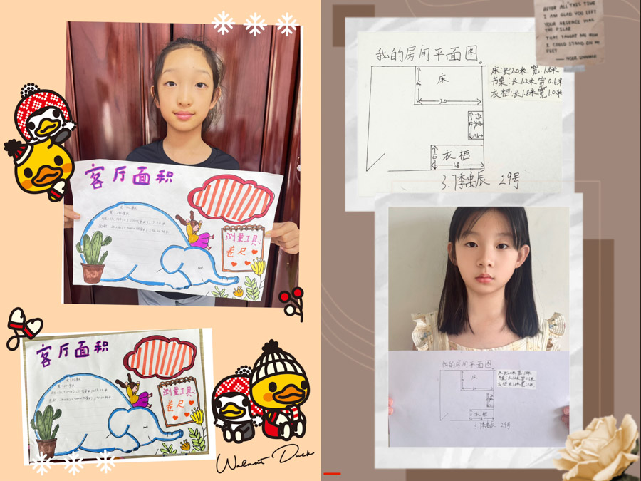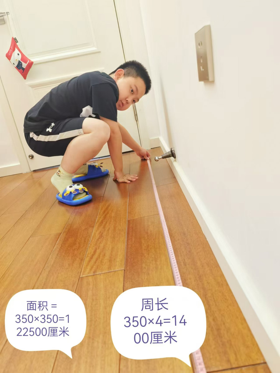 同学们自己动手,赶紧找到家里的测量工具,有学生尺、米尺,还有软尺、卷尺,利用测量工具对自己的卧室进行准确测量。通过实际的测量使同学们对长、宽、周长、面积这些抽象的概念有更加具体和直观的理解。