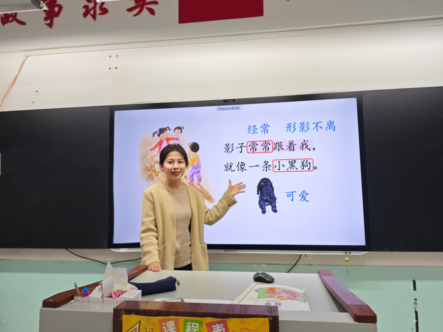 随后,穆老师指导学生朗读《影子》。在朗读进程中,依据新课标对学生观察与思维能力培养的目标,巧妙引导学生关注儿歌里描述影子位置变化的“前”“后”“左”“右”等方位词,运用提问、互动游戏等多样化教学手段,助力学生深度理解这些方位词的含义与用法,促进学生空间观念的形成与发展。当读到“影子常常跟着我,就像一条小黑狗”时,老师引导孩子们想象影子像小黑狗的原因,孩子们天真的回答充满童趣,对影子的喜爱之情也油然而生。穆老师抓住时机指导朗读,使学生在朗读中更好地融入情境,体会情感。