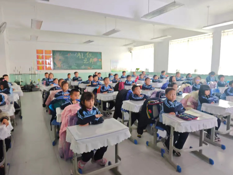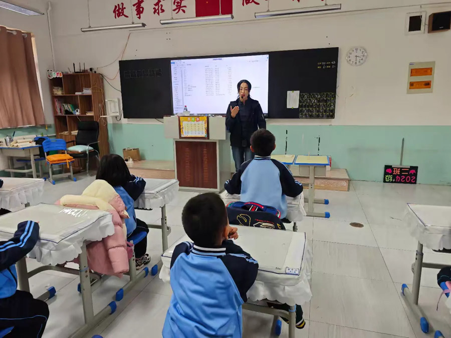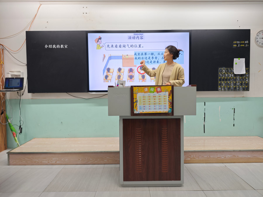 数学课上,穆老师围绕方位词“前后左右上下”展开教学,并设计了两个学习活动。在学习活动一中,重点在于介绍教室,学生需要先梳理教室内的各种物品,如桌椅、黑板、讲台等,然后运用所学方位词,以教室中的某一固定物体或区域为参照标准,对这些物品进行方位描述,比如“黑板在教室的前面,窗户在教室的左右两侧”,让学生清晰理解方位词在实际场景中的运用。
