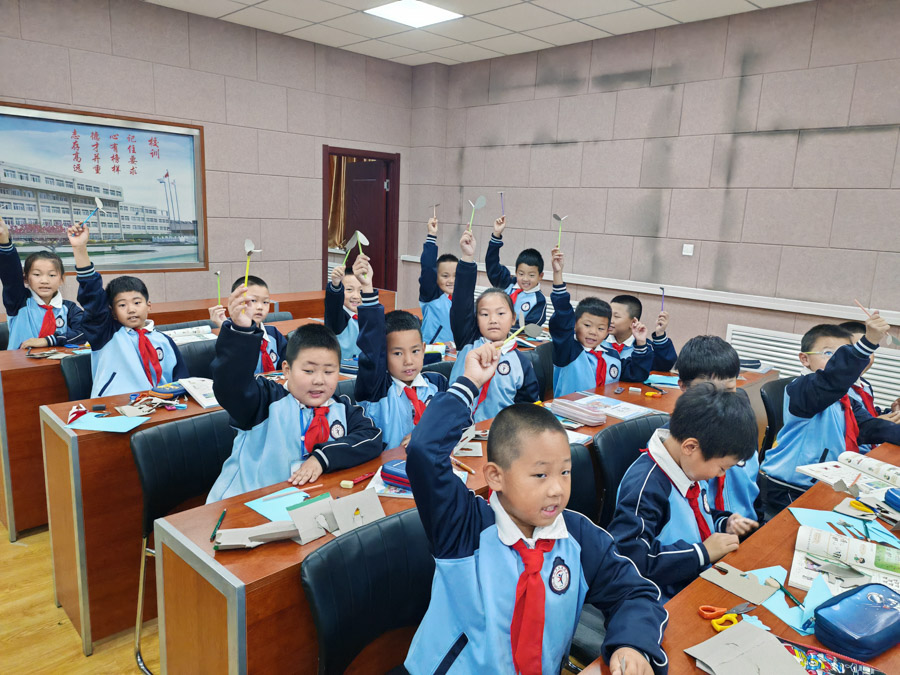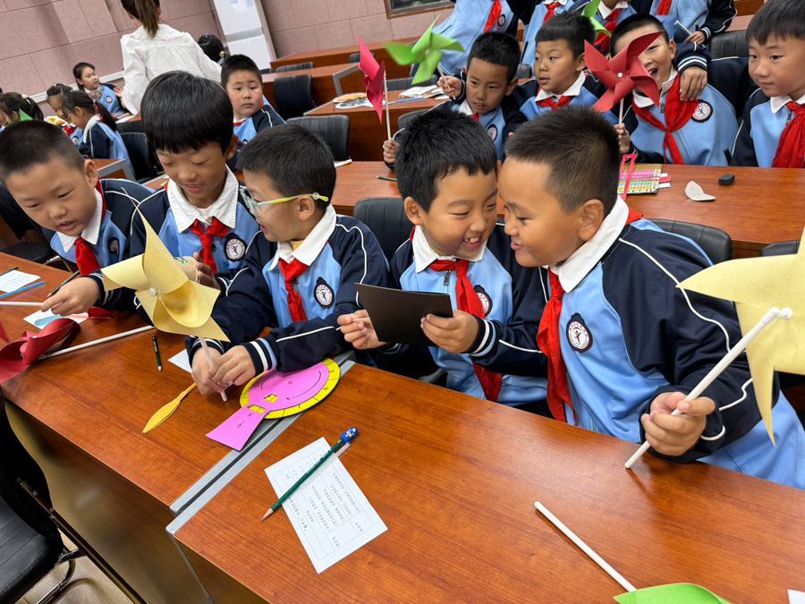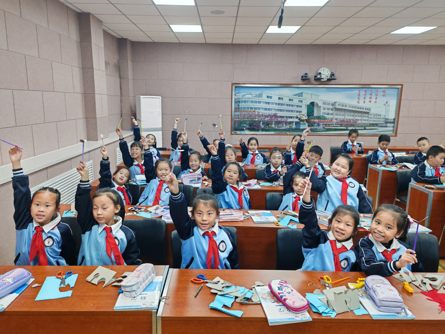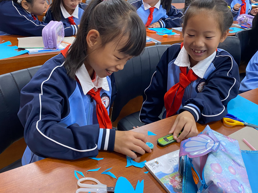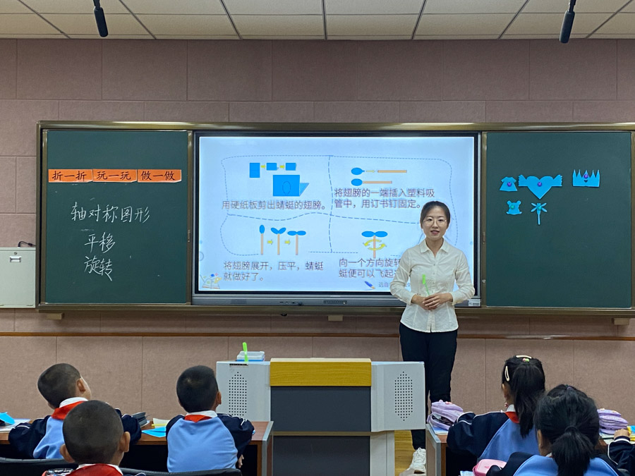 师老师率先剪一幅剪纸作品——手拉手的小女孩们,引出了平移。又用小女孩走路,生动形象地展示了平移的过程,接着通过玩具小车,让学生更直观地感知了平移。随后,师老师通过竹蜻蜓引出了旋转,学生制作了竹蜻蜓,体验了旋转的过程。通过这些活动,学生不仅学会了如何制作竹蜻蜓,还了解了旋转的特点和应用。