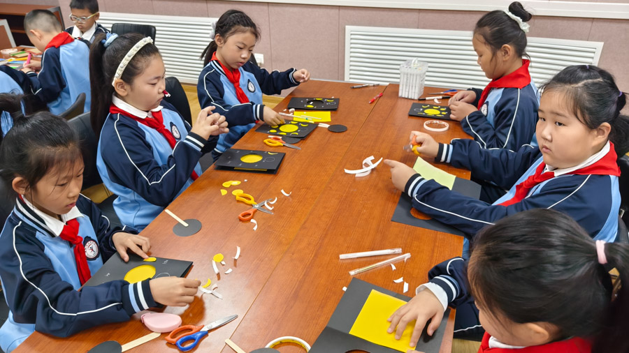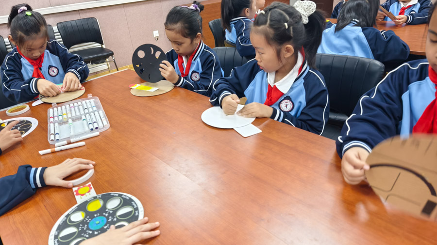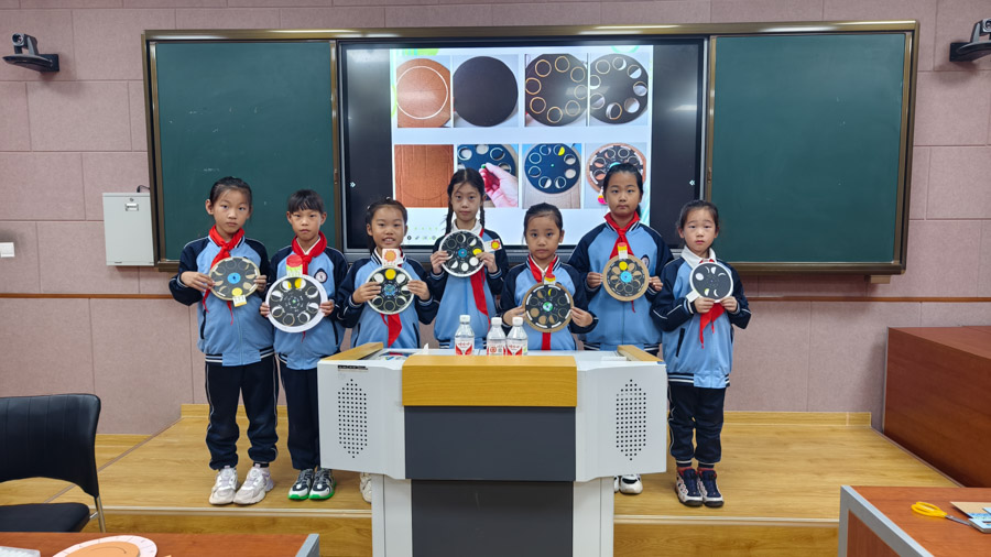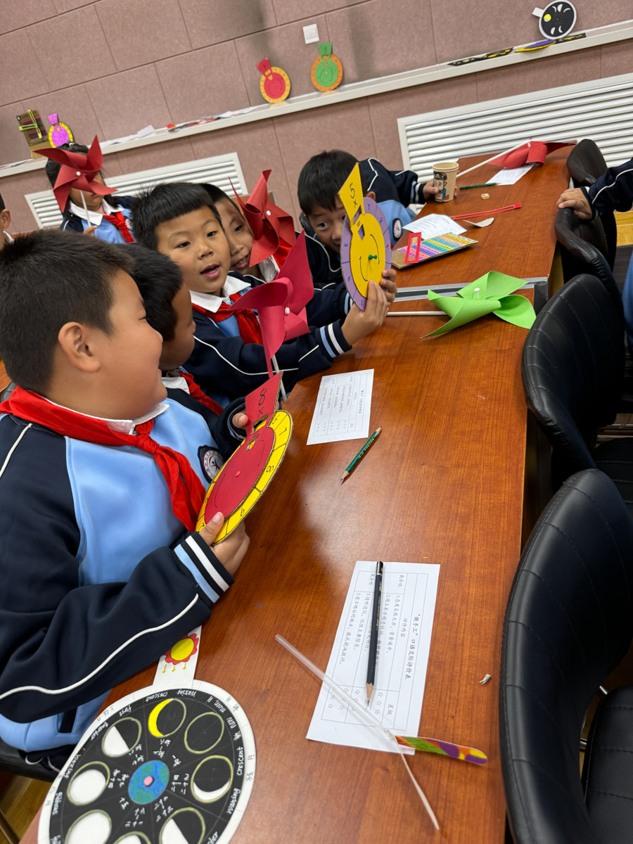 其中,《月相变化》的手工作品极具巧思。同学们利用圆形纸片,通过平移和旋转来模拟月亮在不同时间的形态变化。先剪出多个半圆,将它们按照新月、上弦月、满月等月相进行平移组合,再通过微微旋转调整角度,逼真地展现出月相的渐变过程。