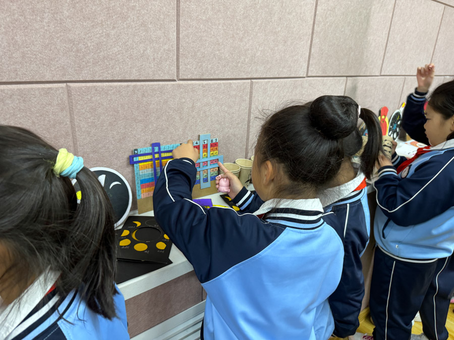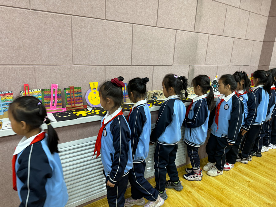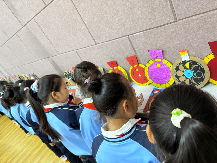 《乘法口诀练习板》也是一大亮点。用硬纸板制作的底板上,小卡片通过平移与旋转拼贴出不同的乘法算式。每个卡片按照乘号两边数字的顺序进行排列,旋转卡片又可以组成新的算式,不但充满趣味,还能帮助同学们更好地记忆乘法口诀。