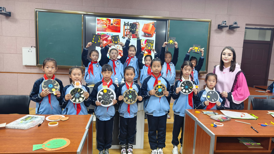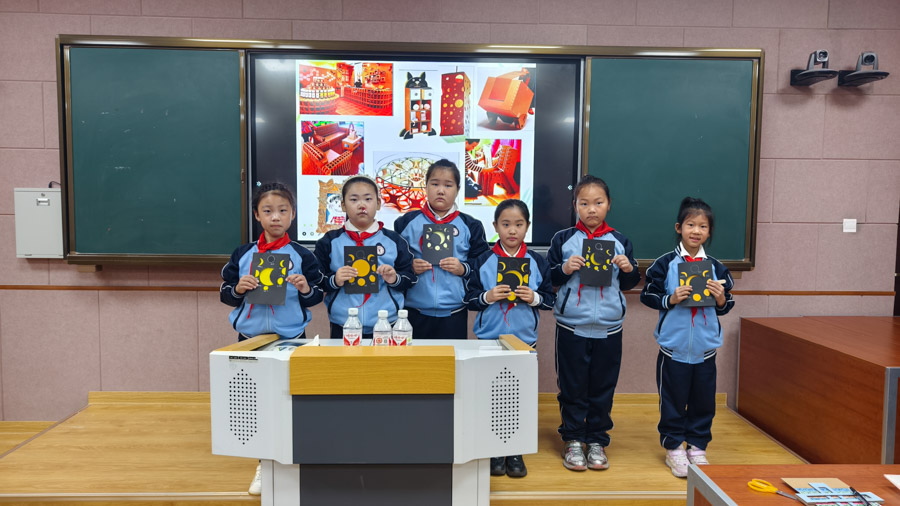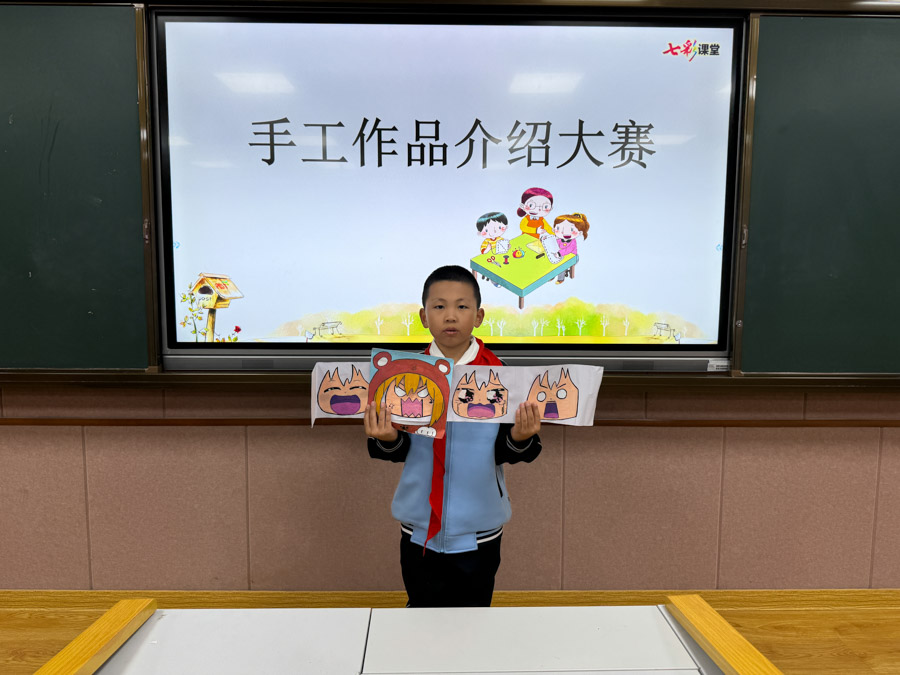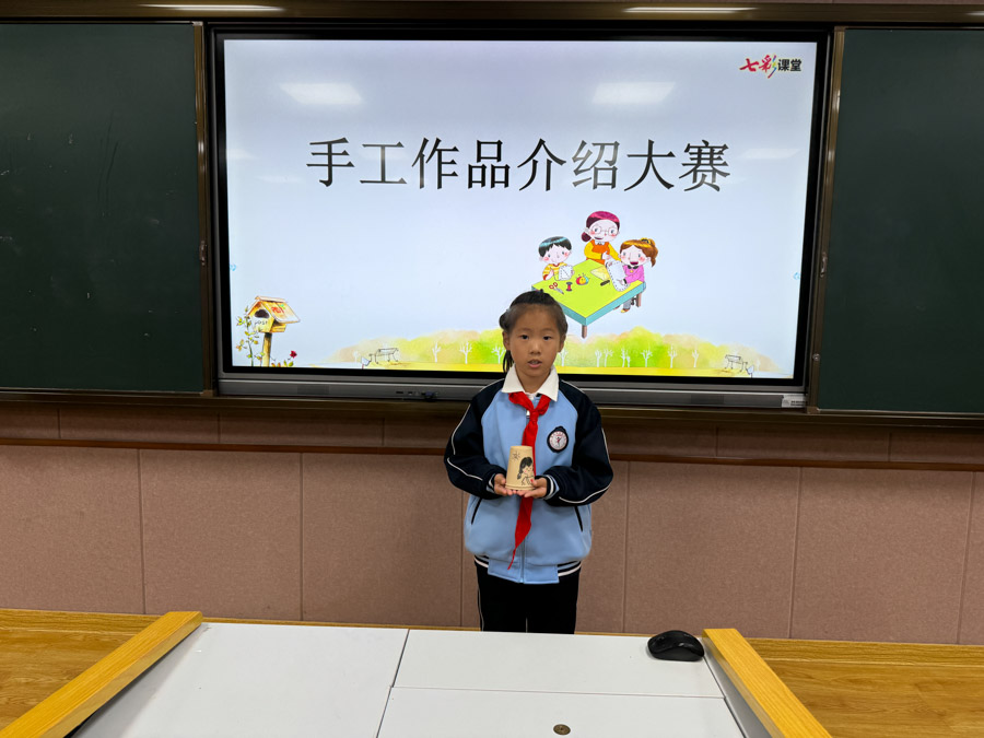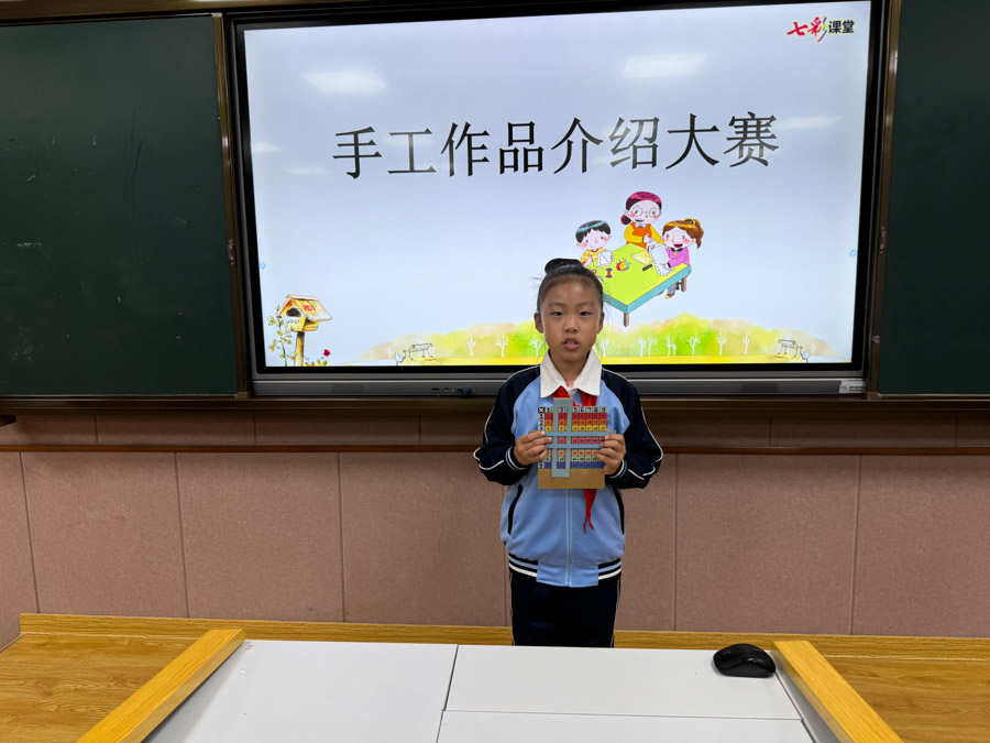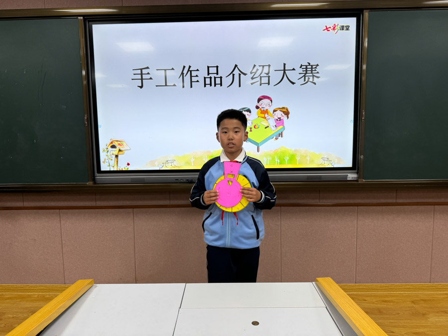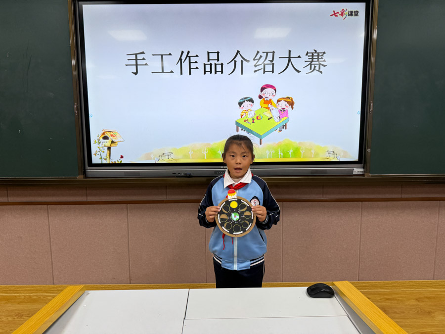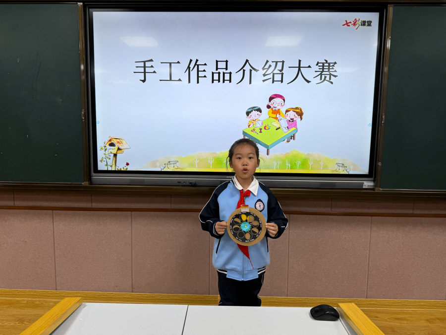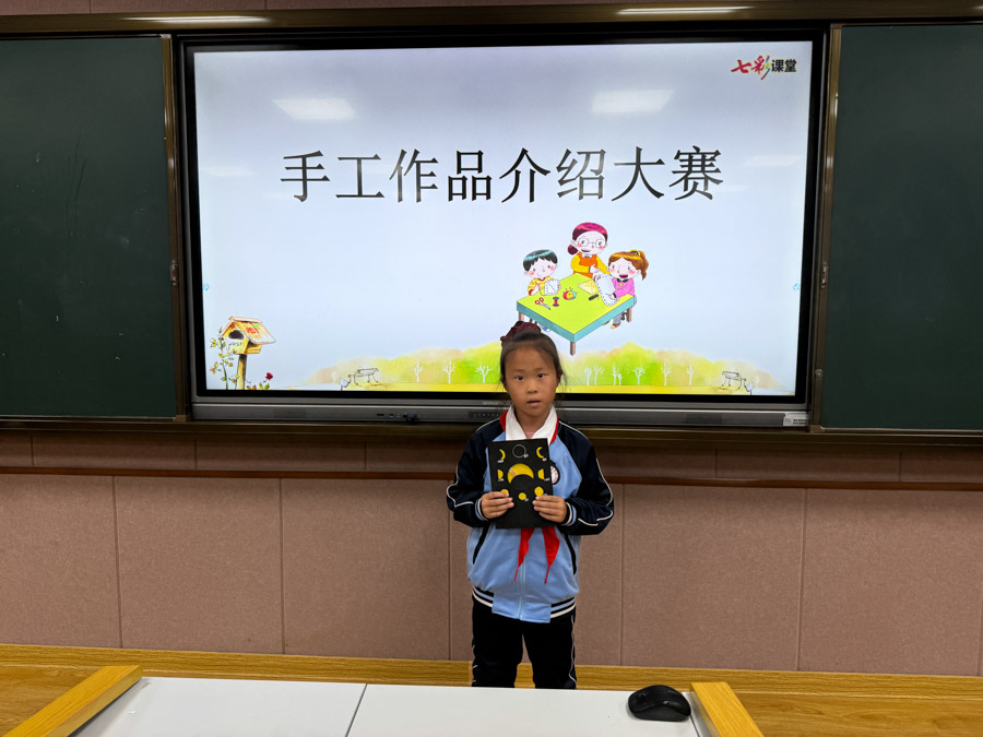 在教室里举办的美术手工作品展,宛如一场创意的聚会。活动伊始,同学们自由参观那些精美的手工作品。一个个独特的小摆件、一幅幅绚丽的绘画等作品在平台上琳琅满目地摆放着。参观完后,大家纷纷说出自己喜爱的作品,然后经过一番讨论,选出那个被大部分人感兴趣的作品。这个幸运作品的制作者会走上前,举着自己的宝贝开始阐述,从“做的是什么”开始,再详细介绍“是怎么做的”:“我做的是旋转的月相变化,先在硬纸板上画一个大圆,并将其分成几个等分的部分,然后将黑色卡纸剪成圆形,在上面画出不同月相的形状,再在硬纸板的大圆上,沿着之前画好的线条切割出相应的孔洞。最后将黑丝卡纸上的月相图案对准硬纸板上的孔洞,固定在一起。”