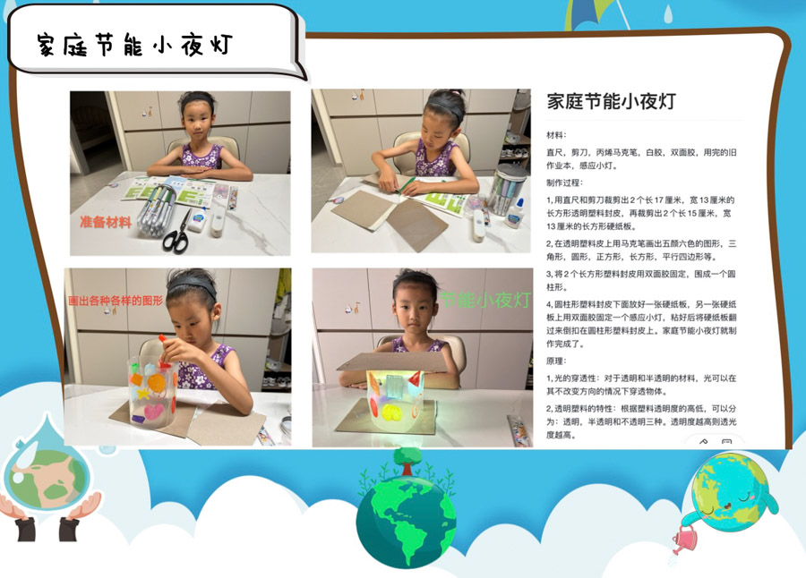 环保节能,关乎我们共同的家园。每一片绿叶,每一滴清水,都是生命的源泉,我们怎能辜负地球的馈赠。在本次项目化学习过程中我们不断思考、不断调整活动内容,同时我们发挥自己的优势,挑战自我,收获乐趣,收获进步!