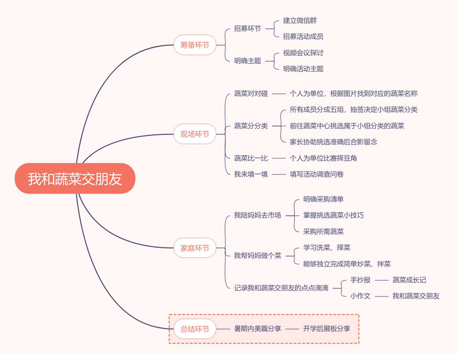 随后,身处不同城市的同学们通过视频会议的方式,针对活动主题展开了一场激烈的讨论,最终明确了六大主题中的“家庭生活”,结合项目化学习方向及特点自拟了“我和蔬菜交朋友”的主题,并齐心协力制定了活动思维导图。同学们计划通过“给蔬菜配对名字”、“帮蔬菜找对分类”、“比赛择豆角”、“画手抄报”、“写小作文”等精彩纷呈的方式,共同完成此次项目化学习活动。