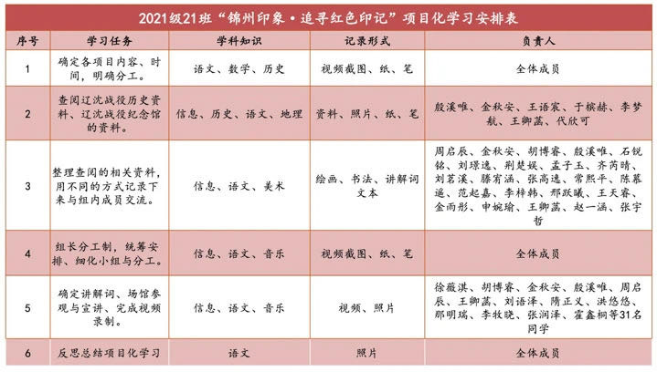 本次项目化学习活动强调同学们的深度参与,深入探究“英雄城市”的红色历史,丰富人生底蕴,坚定理想信念;激发同学们作为锦州“小主人”的积极性,主动探索锦州丰富的红色文旅资源,让更多人了解锦州的红色文化。基于此,2021级21班的同学们在金老师的指导下,以“作为新时代红色血脉的传承者,如何利用搜集的资料,编写一份生动的解说词,向家乡人和外地游客介绍一个红色景点”为驱动性问题,开展了此次学习活动。