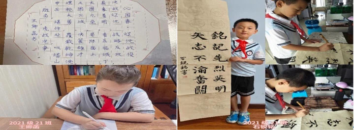 通过多种方式,追寻红色记忆。在实地探访辽沈战役后,同学们回忆起参观当天的讲解内容,并将语文课、阅读课和美术课的知识融会贯通,通过写作、手抄报、书法等形式,继续追寻锦州的印象,追寻那些红色的记忆。