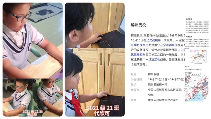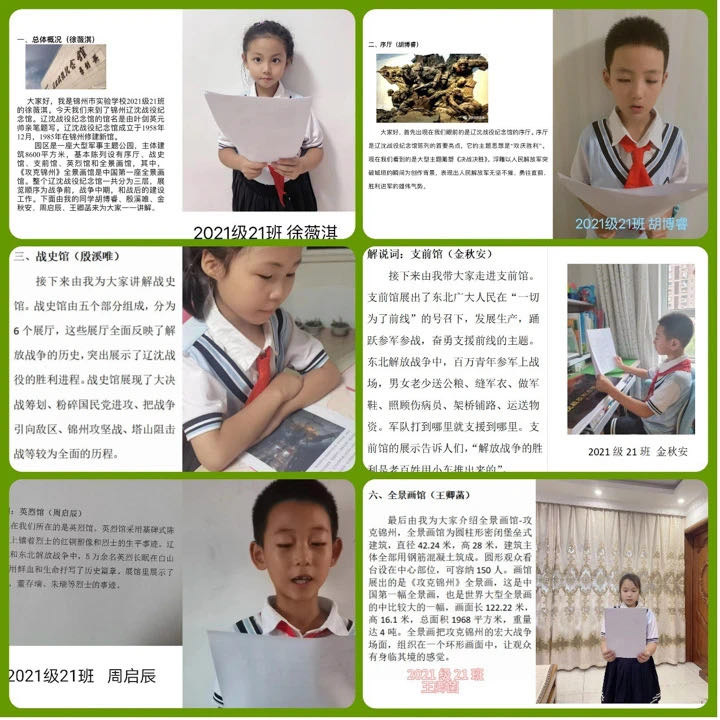 通过讲解视频,展现历史印记。经过一周的背诵、练习、彩排和现场录制,讲解组的成员们在老师和家长的指导下,运用信息技术知识,最终剪辑制作成了属于21班项目化学习团队的辽沈战役纪念馆红色讲解视频。
