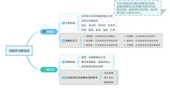 接下来,第2组的徐薇淇、金秋安、周启辰、胡博睿、王卿菡、殷溪唯同学负责搜集解说词和相关讲解资料。他们认识到,讲解是一种以展示为基础的社会活动,它通过科学的语言和其他辅助手段,将知识传递给观众。作为知识的传播者,讲解员必须积极学习并掌握广泛的知识。在讲解之前,通常需要准备解说词,通过精确的描述和渲染,帮助观众了解事物的实际情况、状态和意义。此外,讲解员还需协助观众在观察实物和形象时深化体验,同时利用视觉和听觉,努力达到理想的宣传效果。