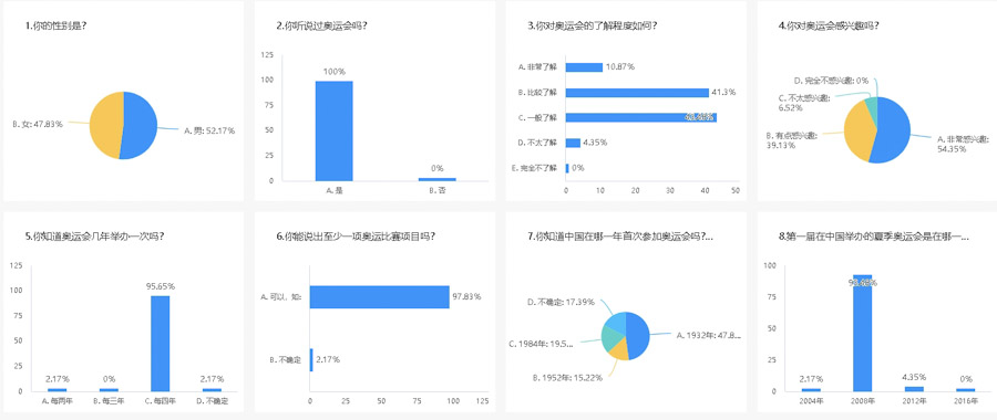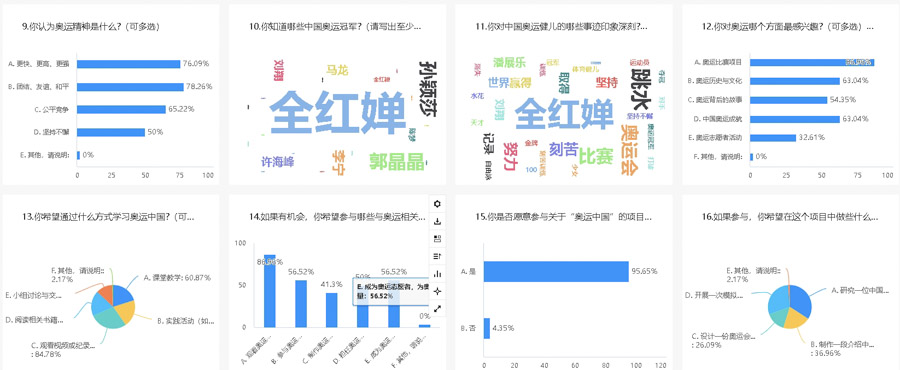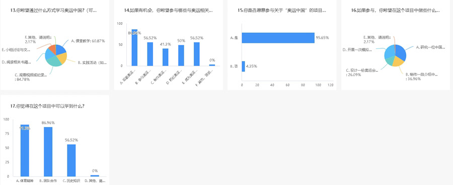 通过此次项目学习,学生们对“奥运精神”有了深入、具体、生动的认识。班主任何老师在学习活动接近尾声时,再次发起一次调查,作为项目后期的重要评估工具。通过数据分析,发现孩子们在活动前、后对奥运会的认知有了重大的变化。从其中的几个题目,就感受到孩子们的学习热情及收获。