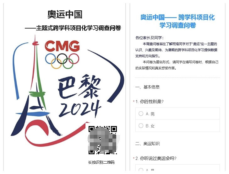 在学习正式开始之前,何老师通过调查问卷的方式了解同学们对“奥运中国”这一主题的认识。调查问卷内容涵盖了奥运历史、奥运精神、中国奥运成就、学生的个人兴趣与期待等多个方面。通过学生的反馈,设计活动方案,为后续的项目化学习提供数据支持和方向指引。