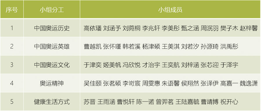 同学们根据兴趣和特长分组,以线上会议的形式,围绕驱动性问题进行初步探讨。最后确定全班42名同学分为5组参与活动,各个小组分别围绕如下问题开展:中国奥运历史、中国奥运英雄、中国奥运文化、奥运精神、健康生活方式。