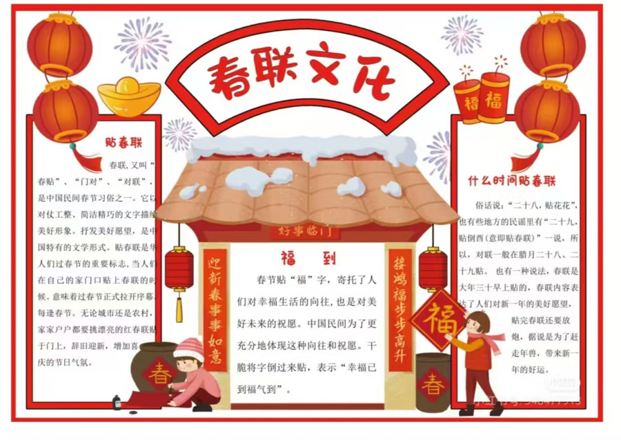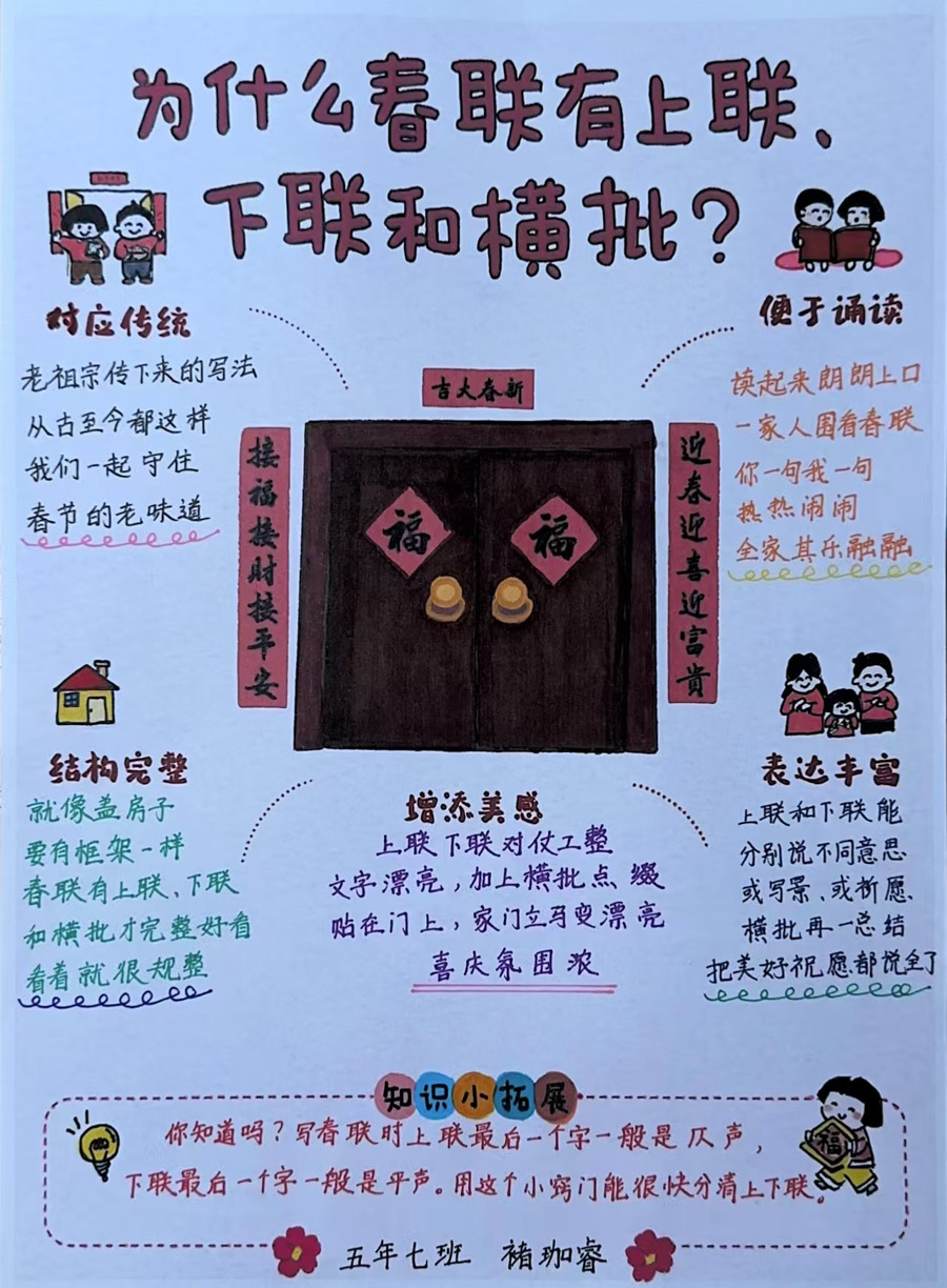 春联不仅是中华文化的载体,同时也可以成为当今小学生不同学科相融合的桥梁,同学们在品春联中学会了春联的写作及古文阅读;在探究春节习俗变迁中,初步理解了朝代的更替;通过写春联、画春联、设计春联,进行了艺术的体验;通过与AI技术的结合,感受了信息技术的魅力。同学们采取制作春联手抄报、绘制春联文化的简图、录制春联相关视频等方式,再一次品味了春联文化,感受了中国年味。