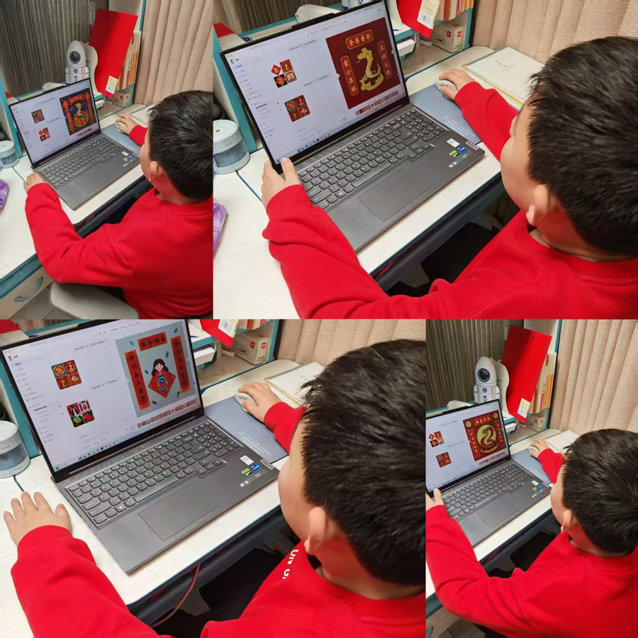 同学们结合实际生活,选择自己要表达的主题,设计了专属于自己的春联,有的同学用绘画和春联相结合的方式进行设计;有的同学用传统和科技碰撞进行设计;有的同学用毛笔书写出专属春联。通过设计春联这一环节,同学们不仅能收获知识与技能,更能在“手脑并用”中感悟中华文明的智慧与温度,让传统文化真正“入心”而非“入耳”。