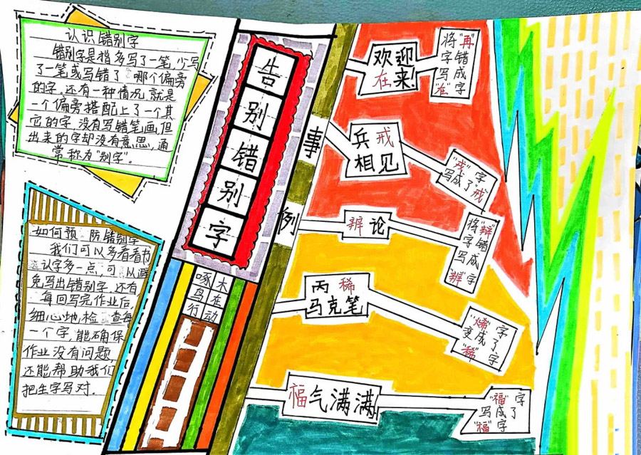 1.个人构思:学生结合前期对错别字的了解与分析,以个人为单位,构思宣传规范祖国语言文字的手抄报内容与形式。可以从强调错别字危害、普及正确汉字知识、呼吁公众重视汉字规范等方向出发,设计简洁有力、富有创意的宣传标语,如 “错别字‘找茬’,守护文化净土”“别让错别字‘偷’走城市文明”;同时考虑运用何种视觉元素(如卡通形象纠正错别字的画面、醒目的彩色字体突出正误对比)能让告示牌更具吸引力。