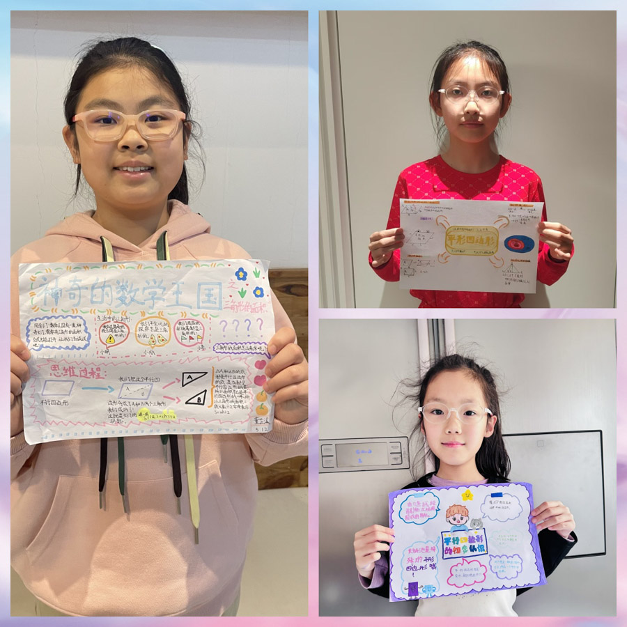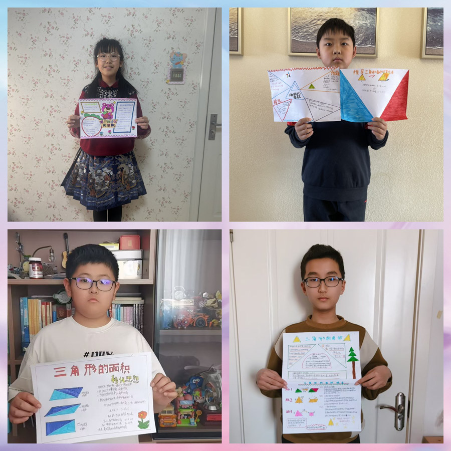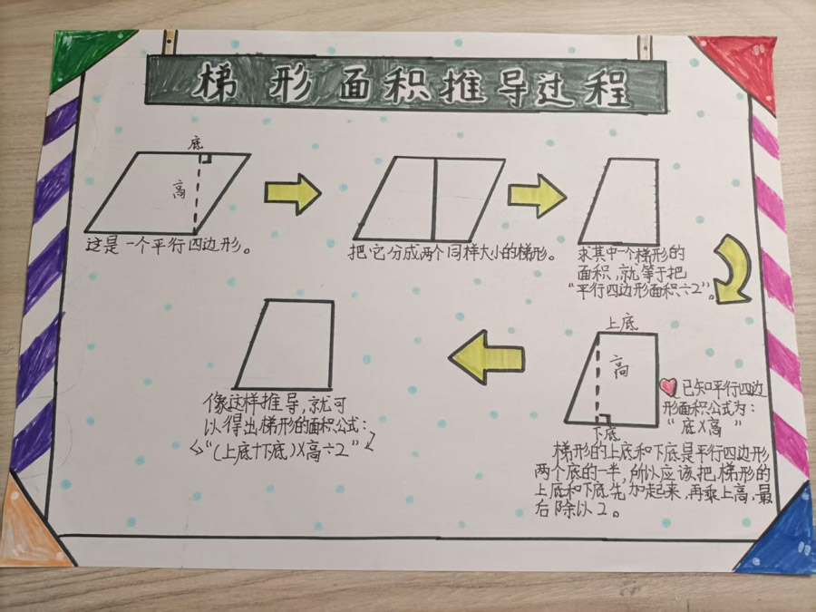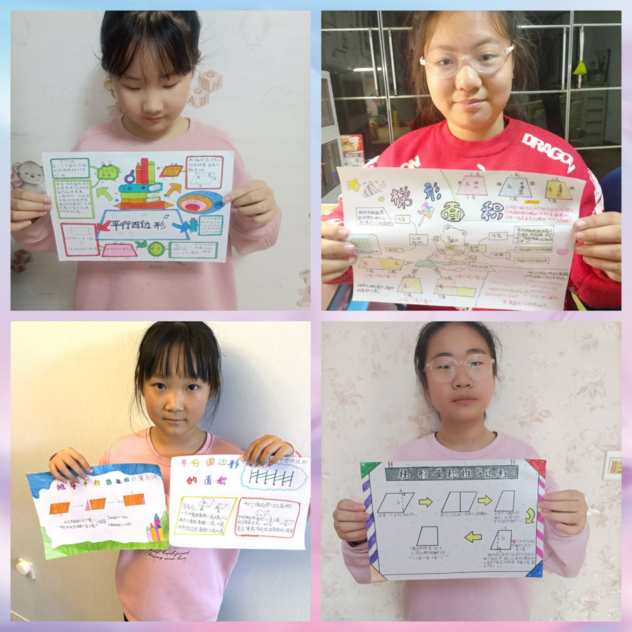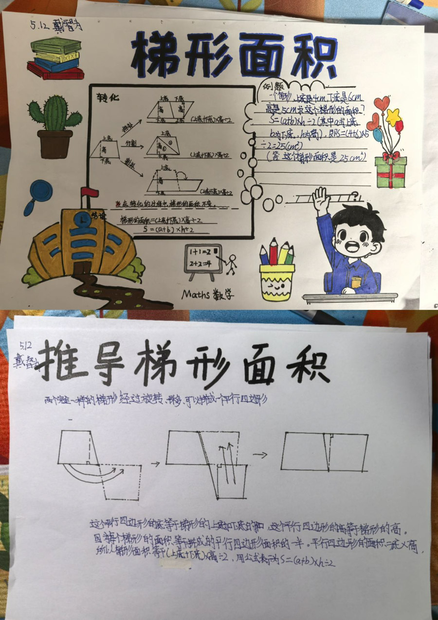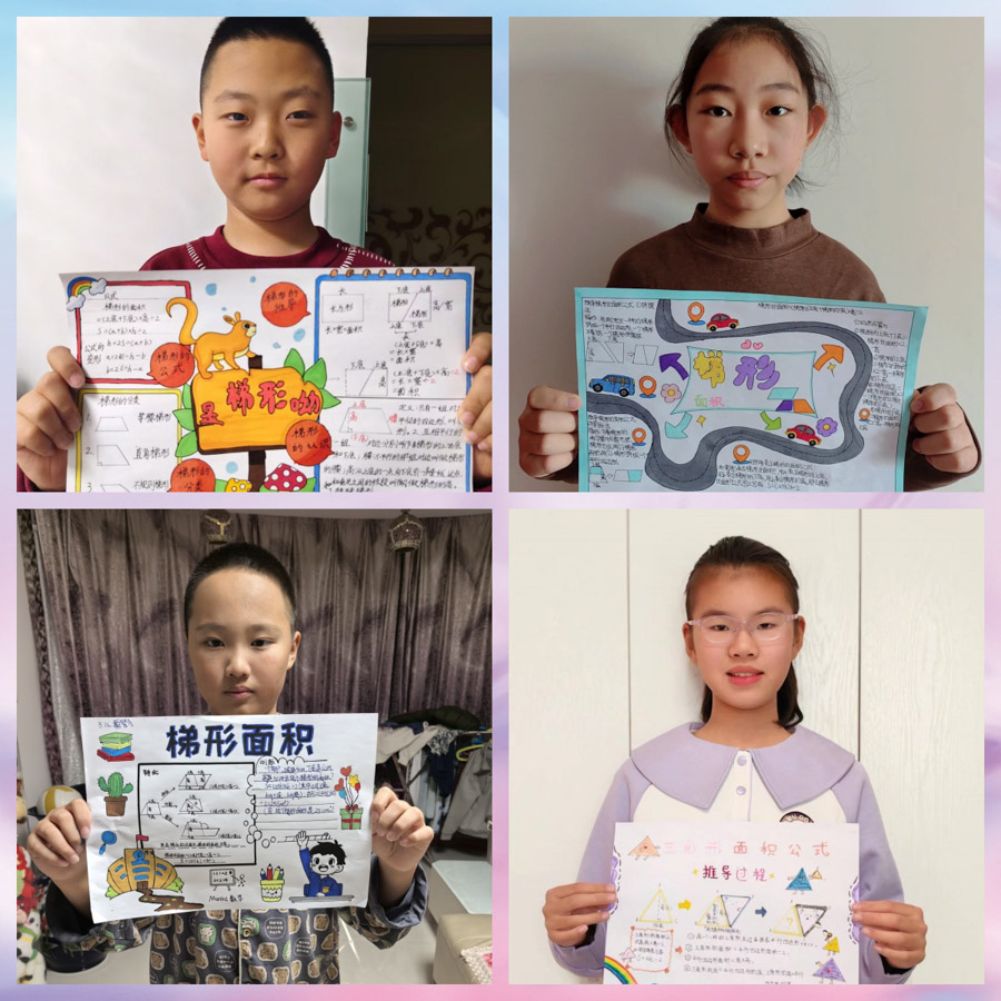 2020级12班的同学们在赵老师的带领下,将本次数学实践活动的主题确定为“绘制多边形面积手抄报”,在用割补,分解等方法探索图形面积过程中,理解并掌握平行四边形、三角形和梯形的面积计算公式,会计算图形的面积,体验“转化”的思想,发展推理和解决问题的能力,获得成功探索问题的体验。