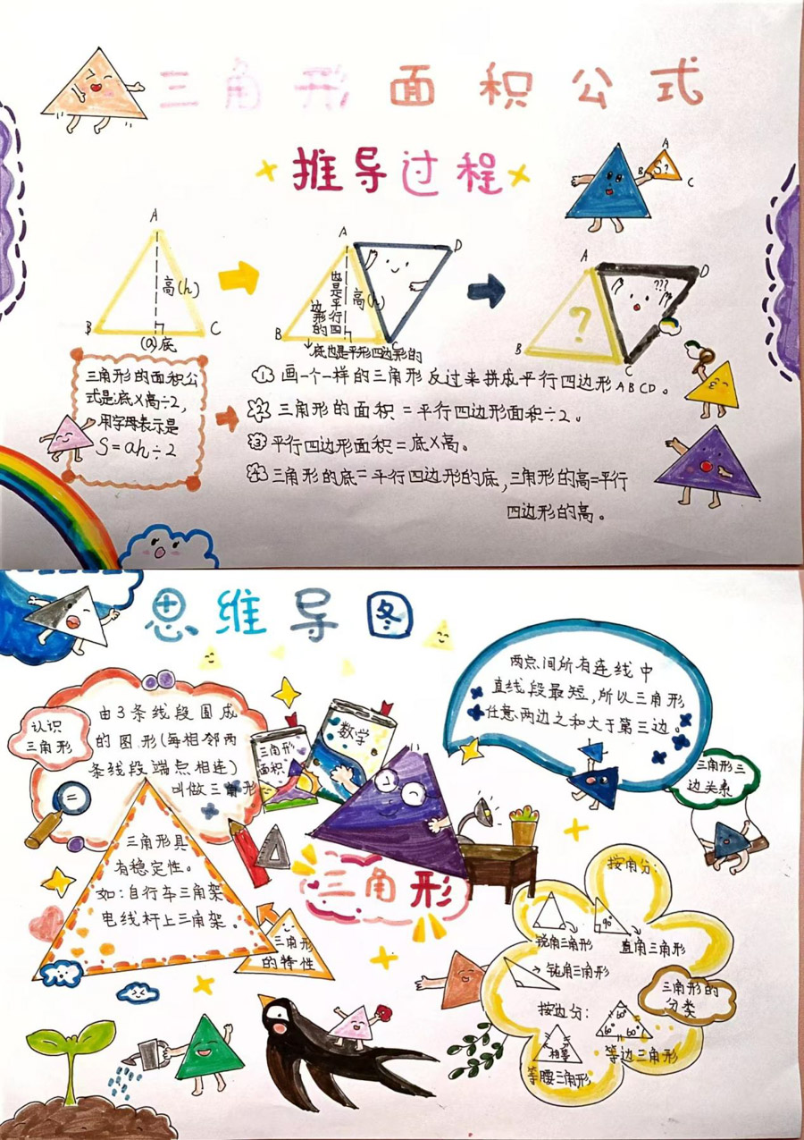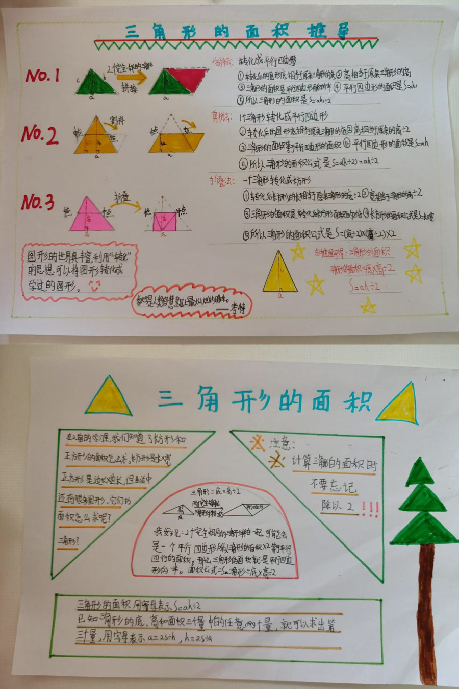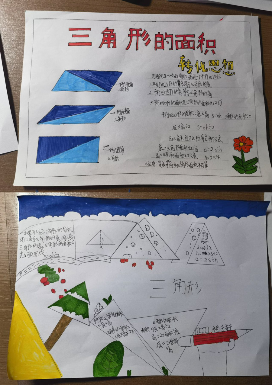 “手是意识的伟大培育者,又是智慧的创造者”有效的数学学习活动不能单纯依靠模仿和记忆,动手实践是掌握知识的有效途径,同学们将三角形、平行四边形、梯形的面积公式的推导过程用手抄报的形式表达出来。