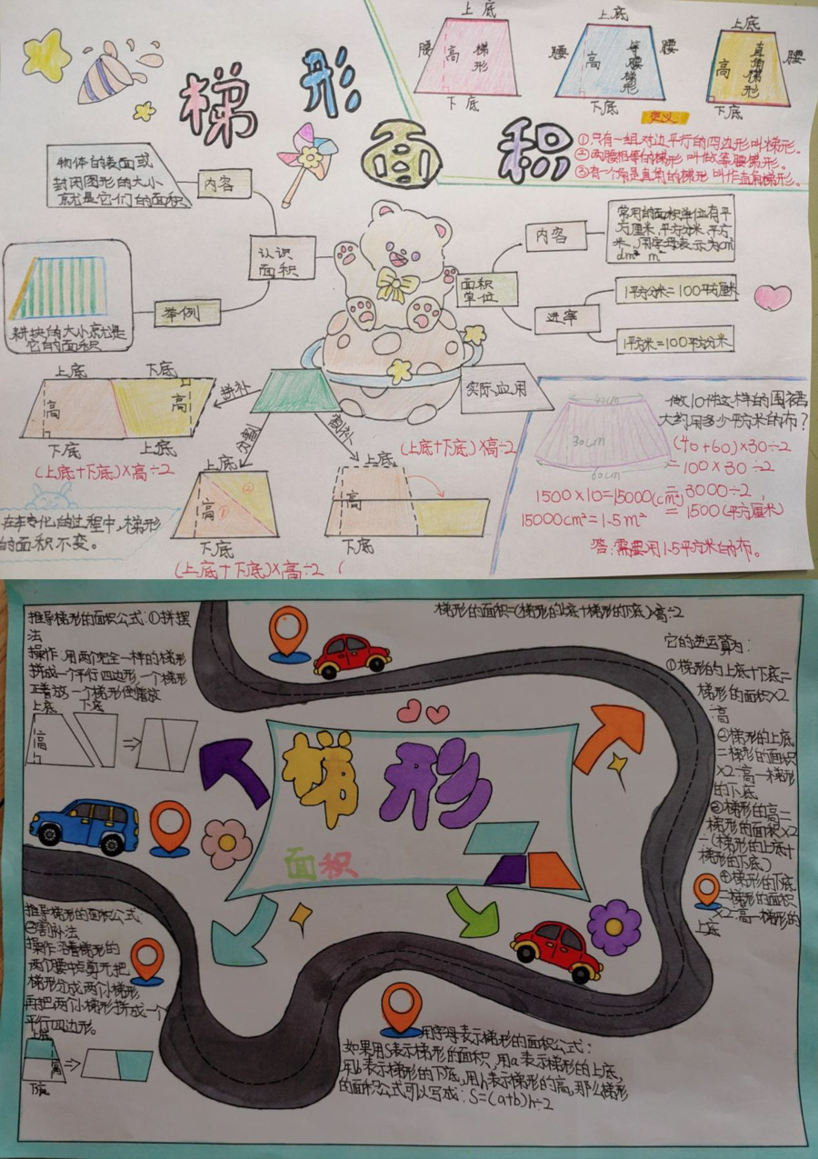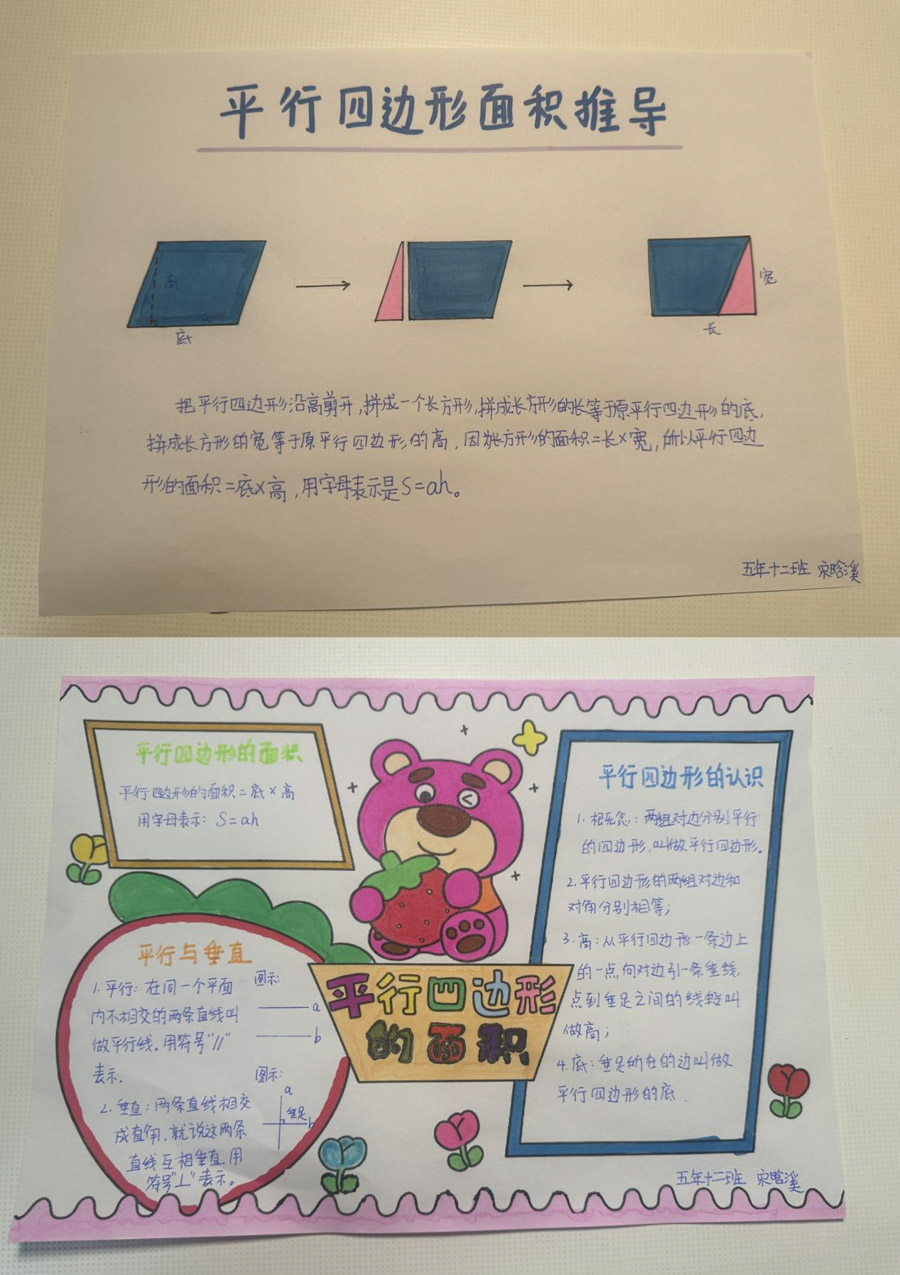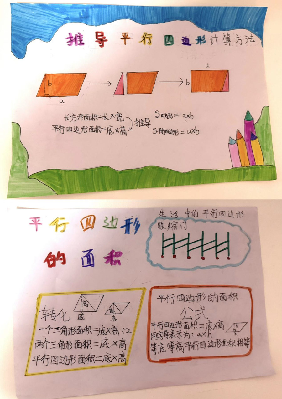 “手是意识的伟大培育者,又是智慧的创造者”有效的数学学习活动不能单纯依靠模仿和记忆,动手实践是掌握知识的有效途径,同学们将三角形、平行四边形、梯形的面积公式的推导过程用手抄报的形式表达出来。