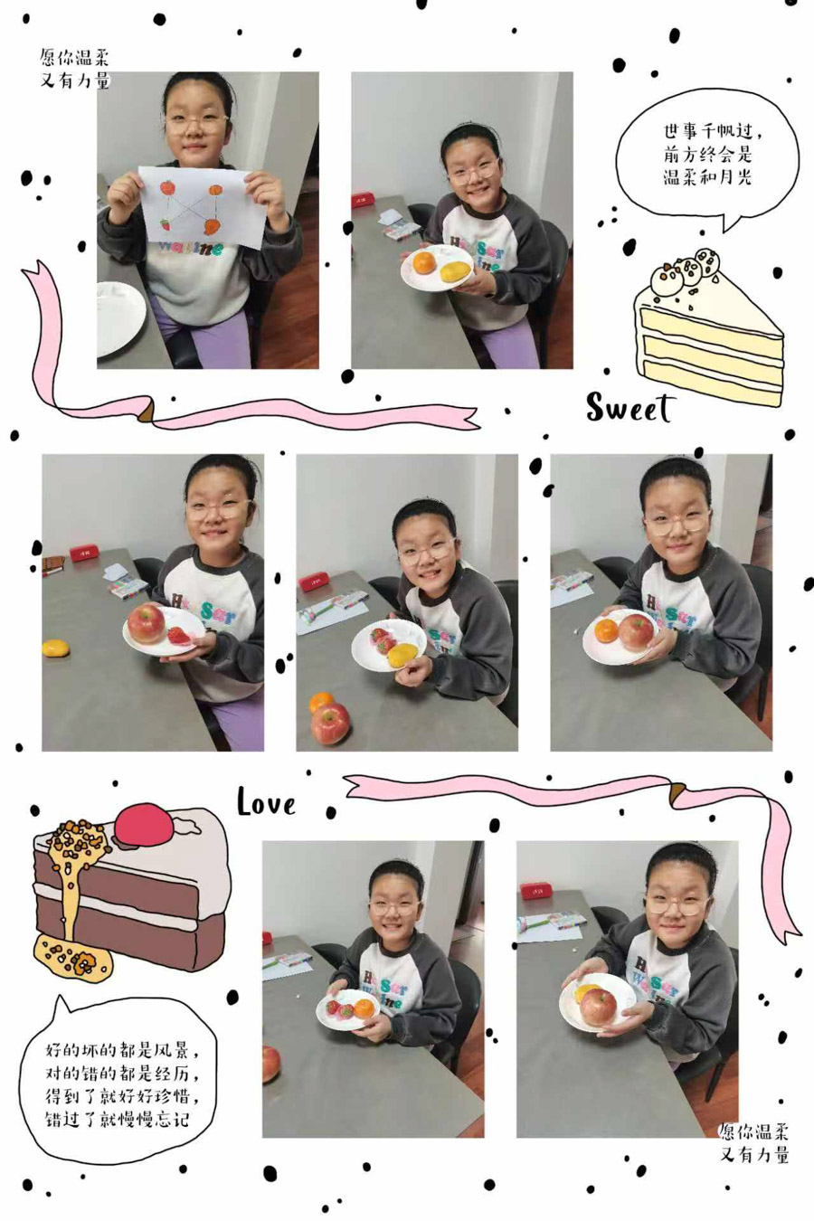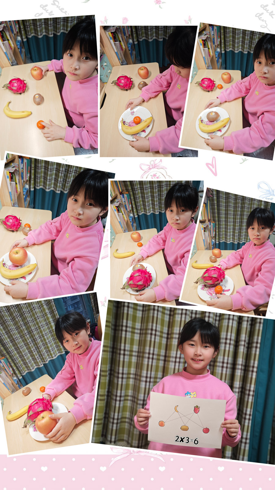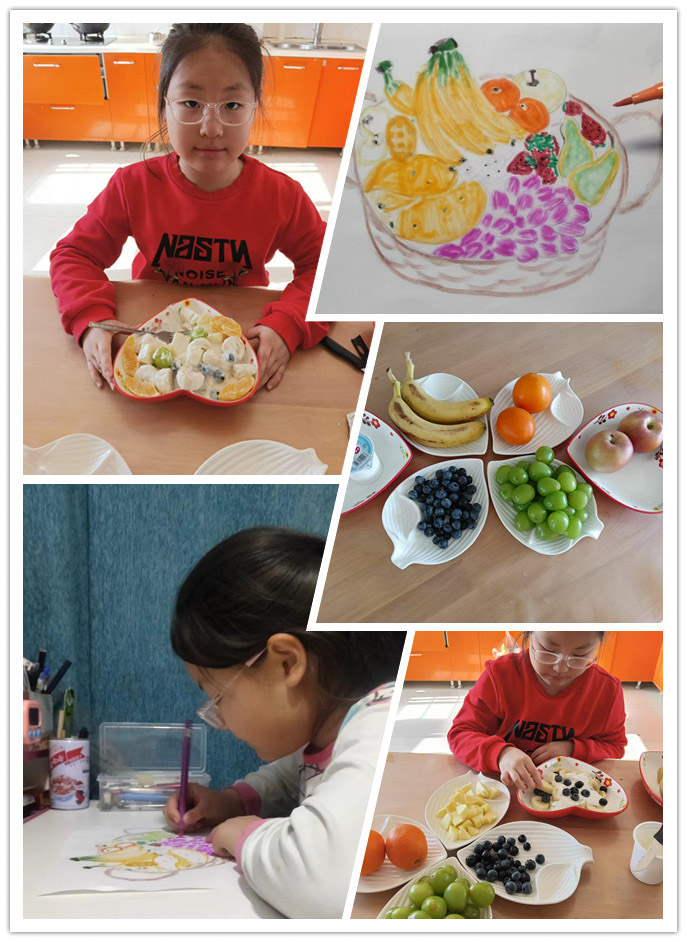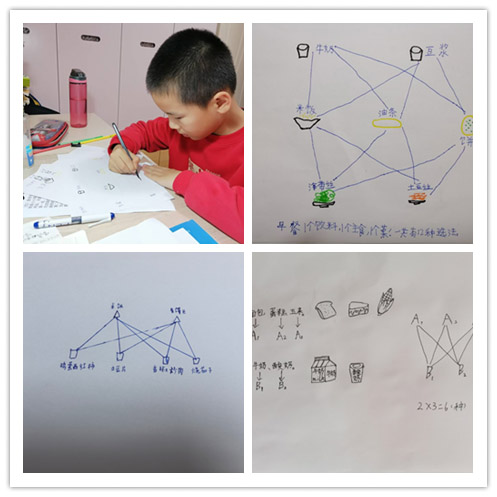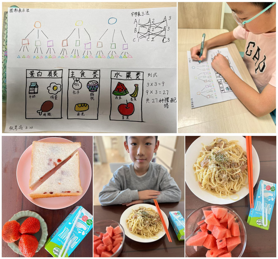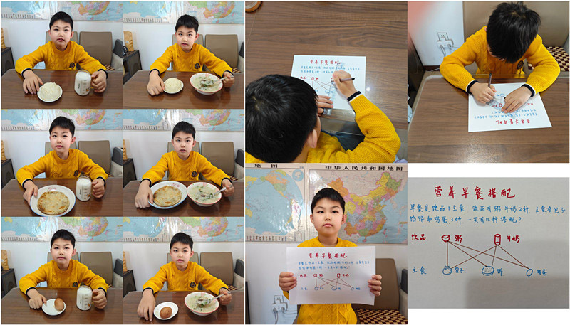 同学们通过查阅资料、询问家长等方式,了解各类食物的营养成分,如富含蛋白质的肉类、豆类,富含维生素的蔬菜、水果等。随后同学们尝试为自己设计营养食谱。有的学生精心搭配早餐;有的同学搭配丰盛的午餐;还有的同学根据颜色口味搭配水果,制作水果拼盘。在搭配过程中同学们计算不同食材搭配出的食谱种类,例如从 3 种主食、3 种蔬菜中选择主食、蔬菜各一种进行搭配,运用简单的乘法原理算出有 9 种搭配方式。在拍摄餐食的同时,还将搭配的过程绘制成图画。