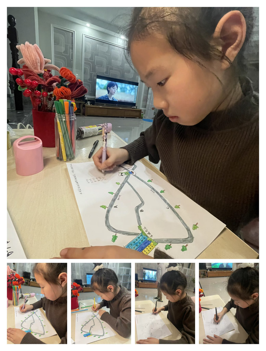 这个小组的同学们都变身为小小路线规划师,根据实际情况,或选择旅游路线搭配,或选择散步路线搭配,或选择出行路线搭配,总之积极观察发现出发地到目的地的路线,并进行比较,最后将自己发现的路线进行搭配组合,并绘制成图画。