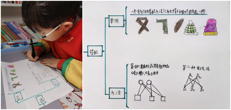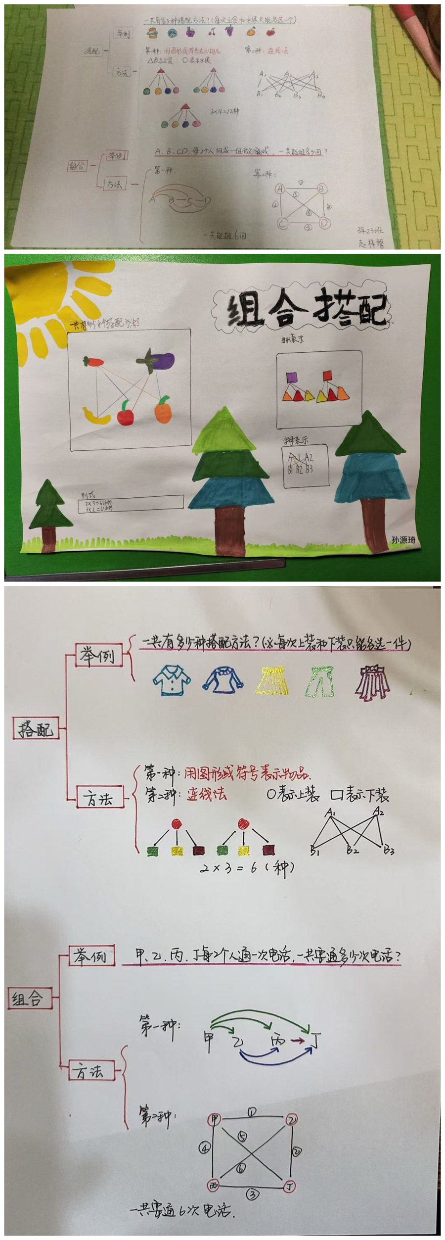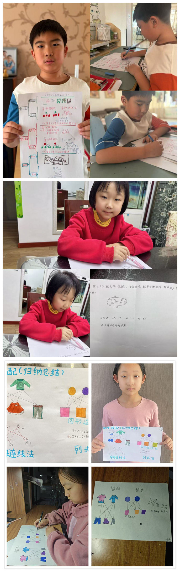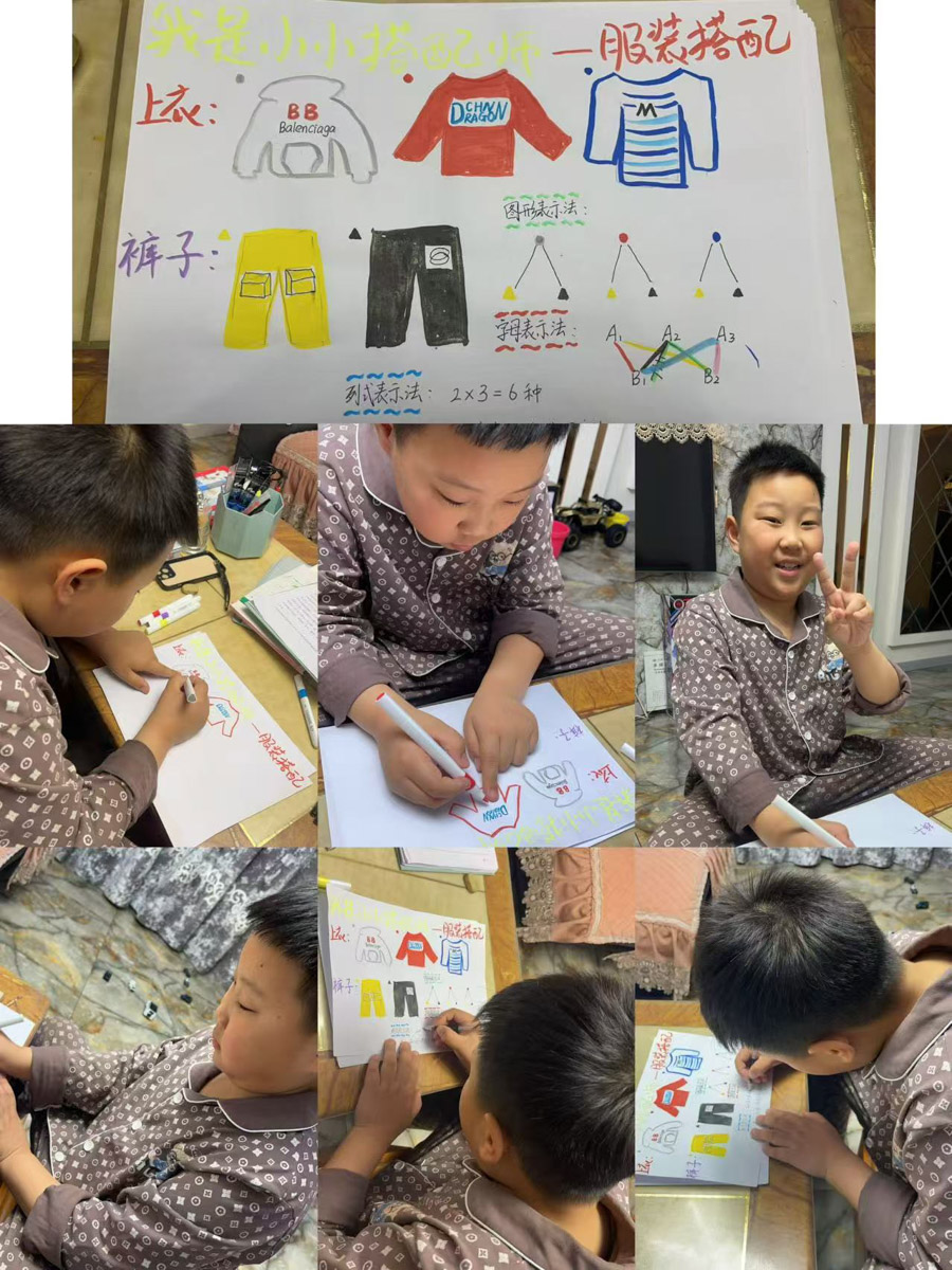 同学们针对不同的场合不同风格进行服装搭配。在搭配时考虑服装的风格、颜色协调性等因素。同学们统计不同服装搭配的数量,比如3 件上衣、3 条裤子,通过简单计算得出有9种搭配方式。最后同学们用拍照的方式记录自己的服装搭配,用画图的方式展示搭配结果。