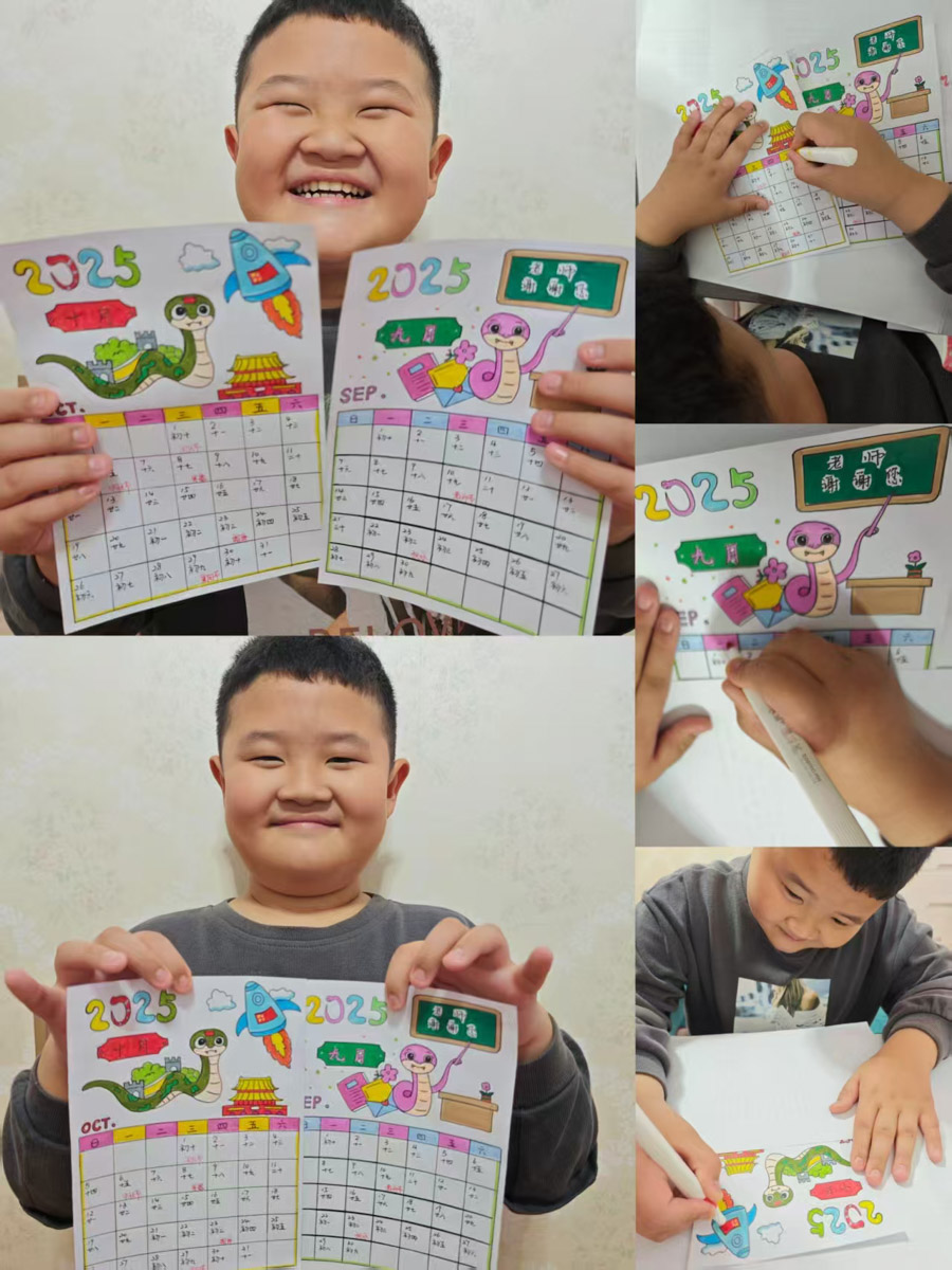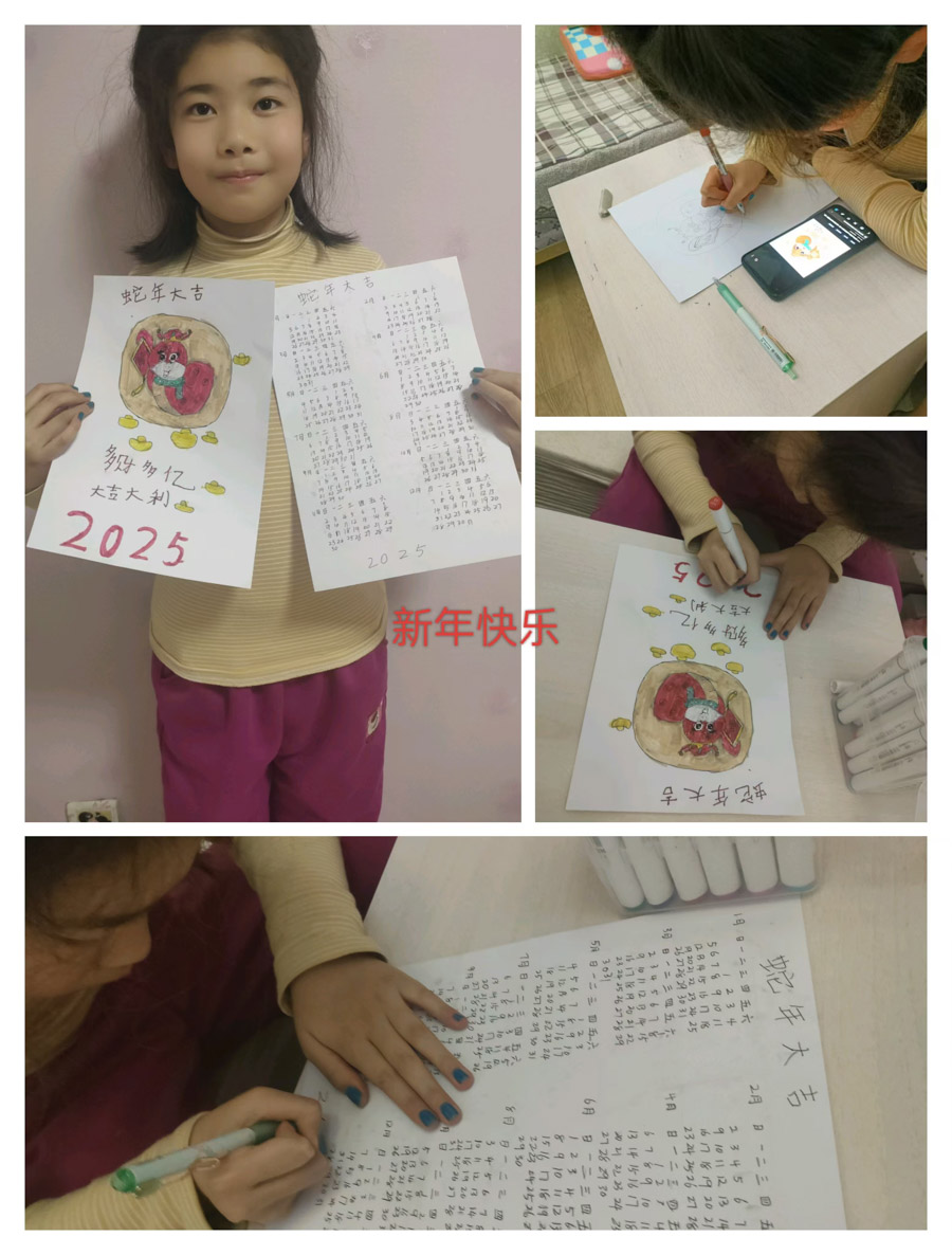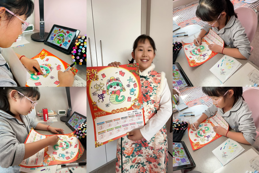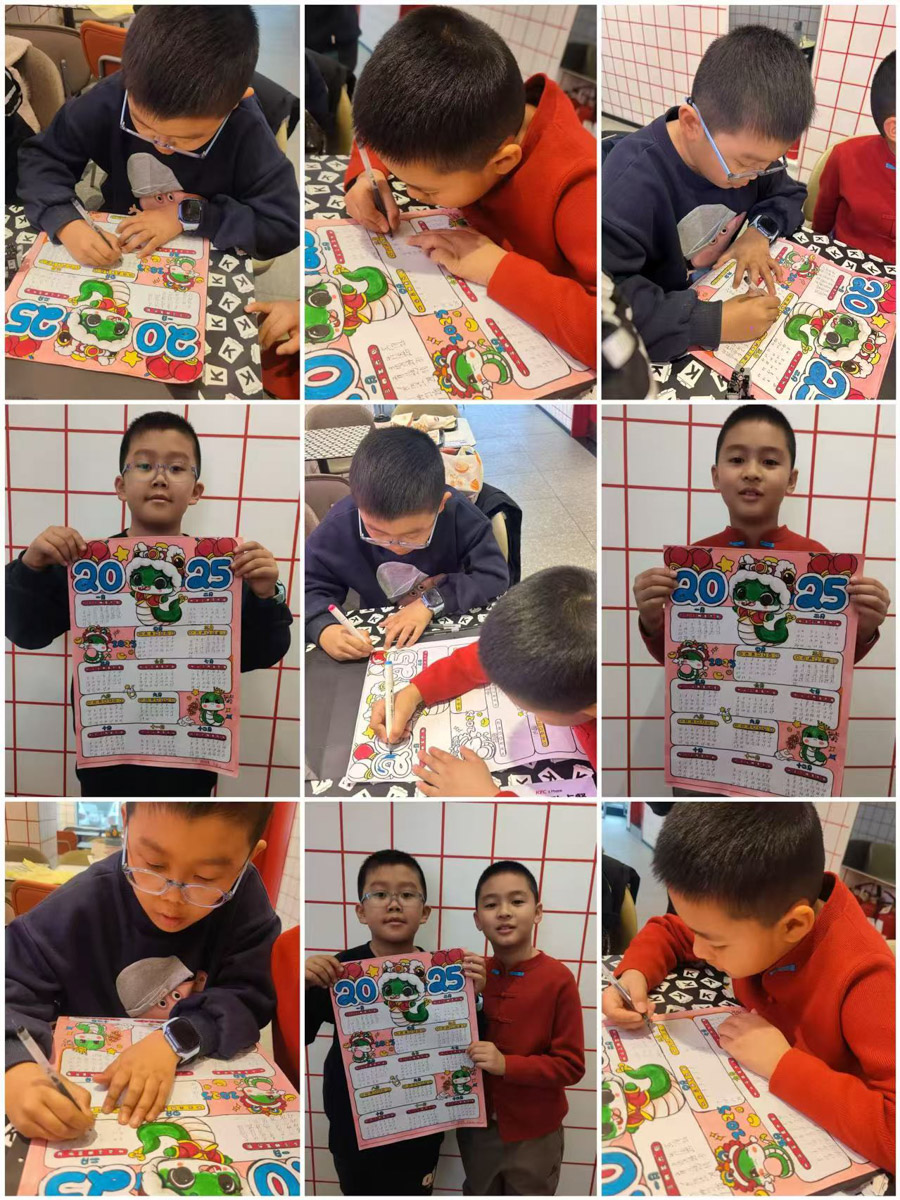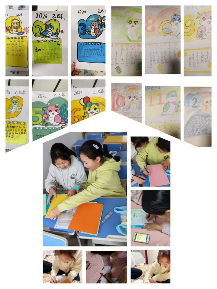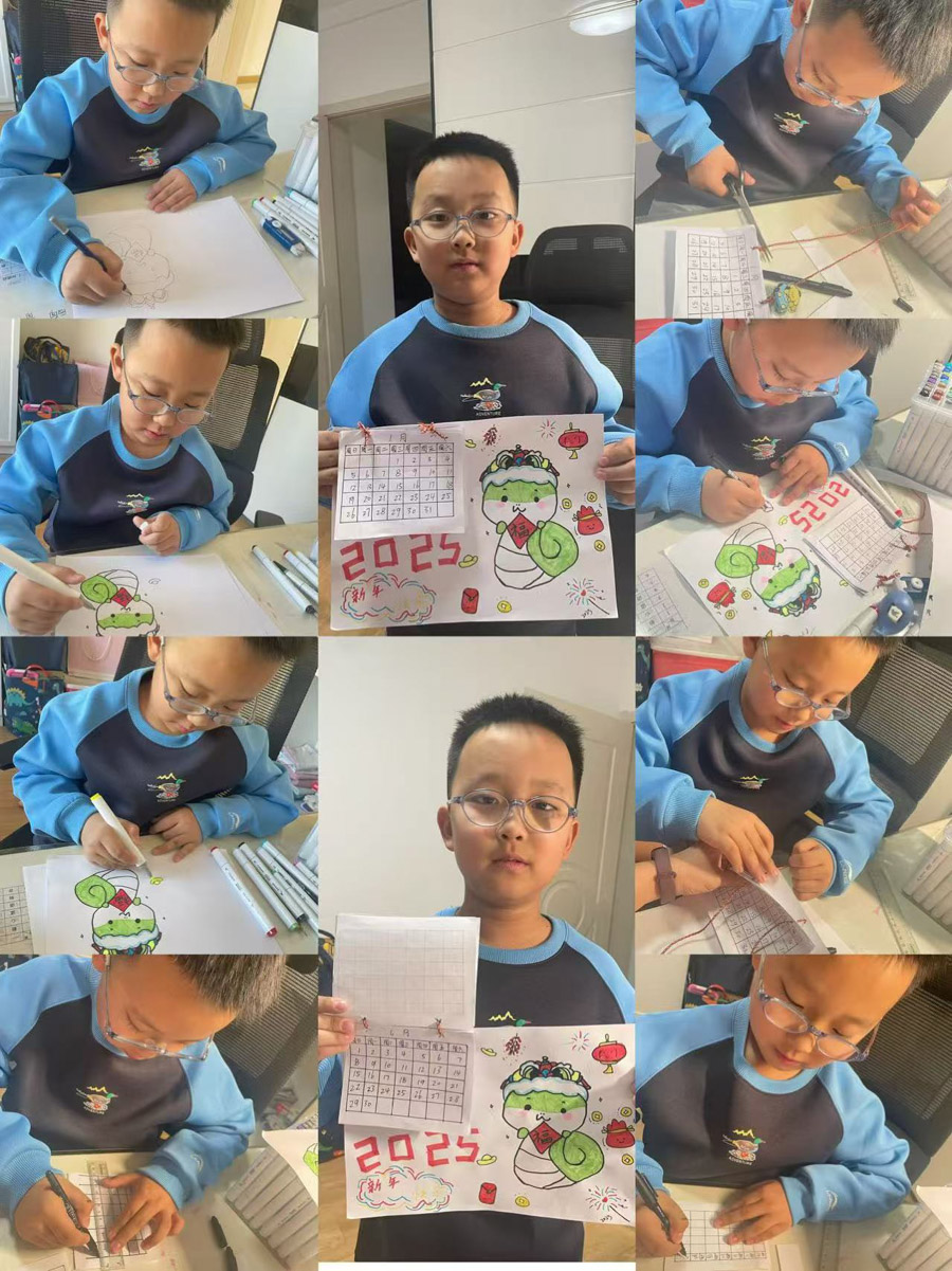 在做足准备工作后,孩子们运用了数学学习过的“年、月、日”和“日历中的规律”,应用了美术学科的构图,开始动手绘制蛇年日历啦!看,他们画得多认真啊!