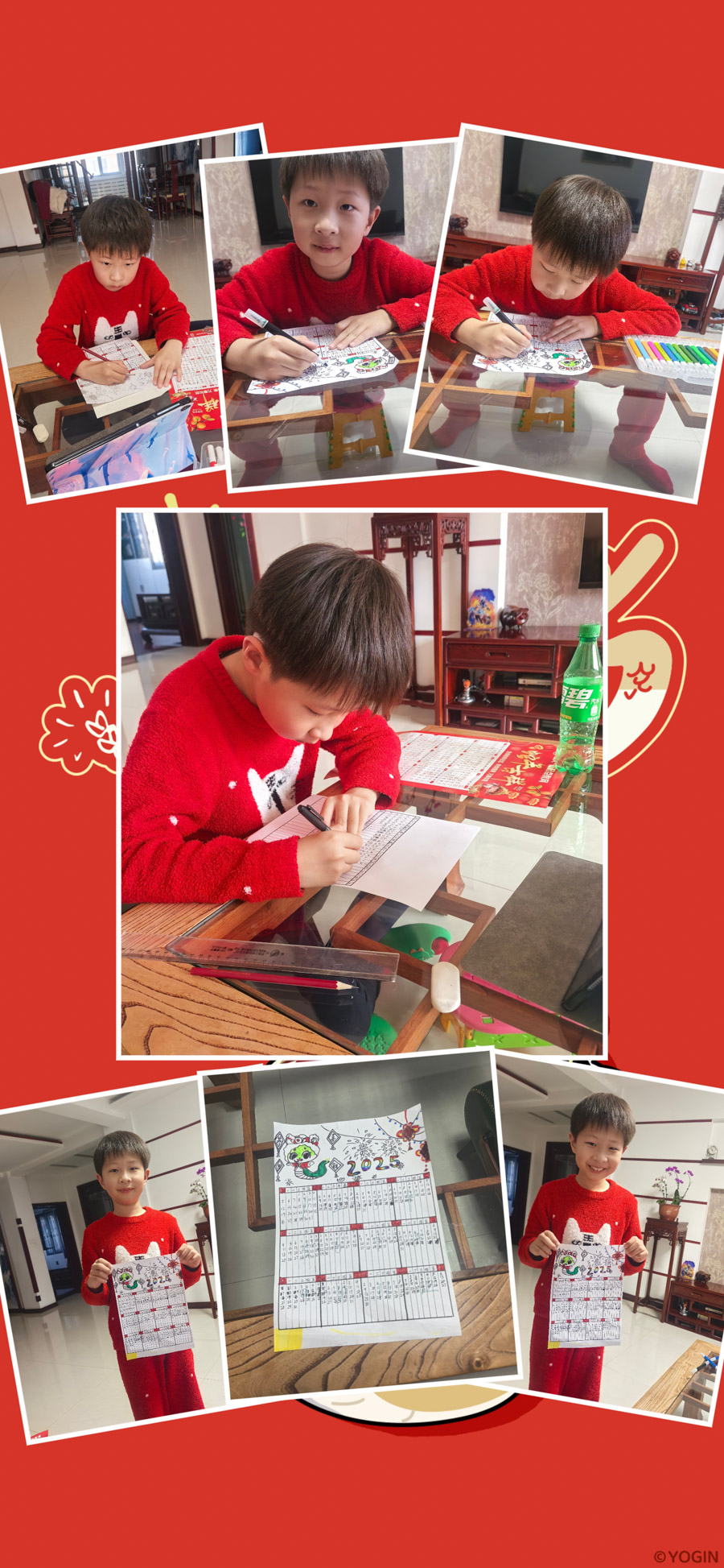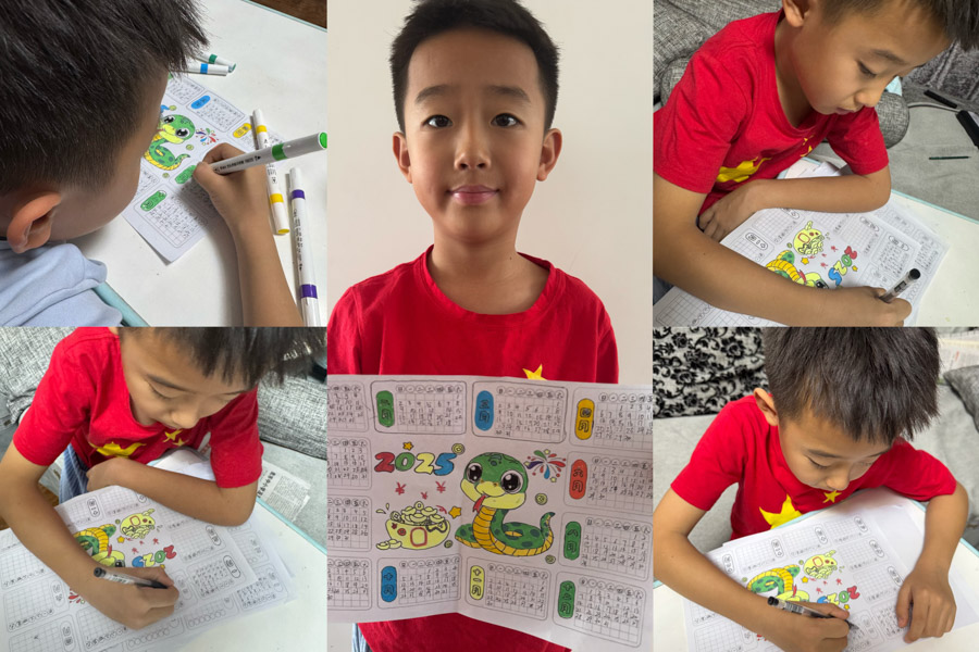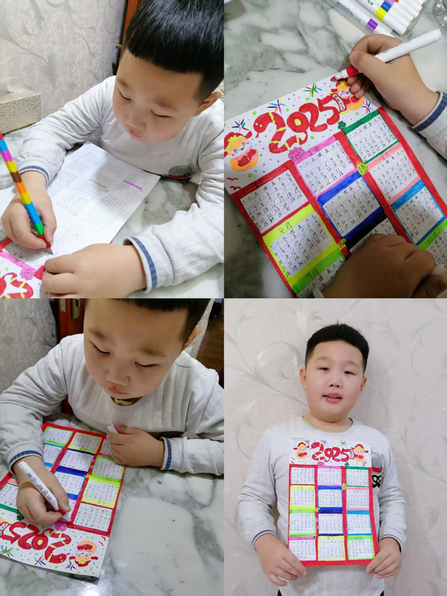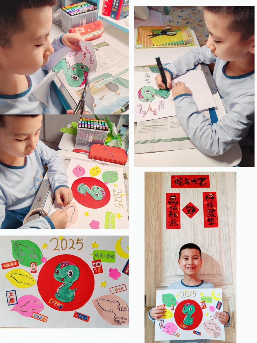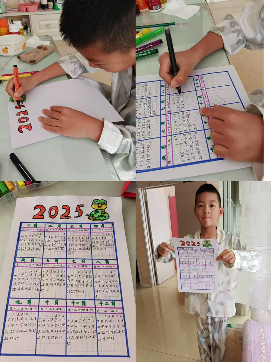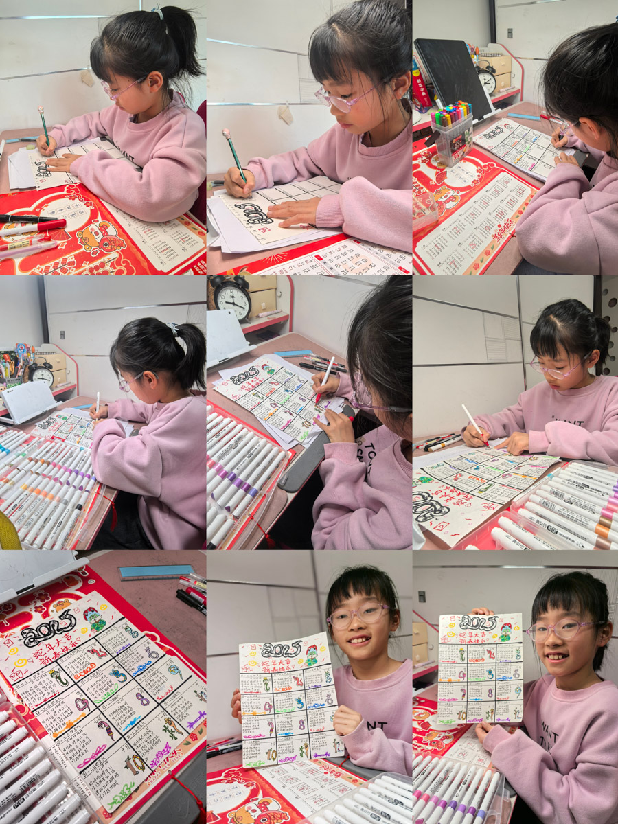 在做足准备工作后,孩子们运用了数学学习过的“年、月、日”和“日历中的规律”,应用了美术学科的构图,开始动手绘制蛇年日历啦!看,他们画得多认真啊!