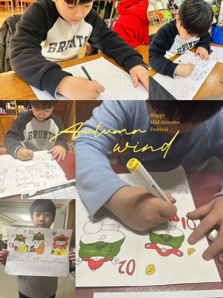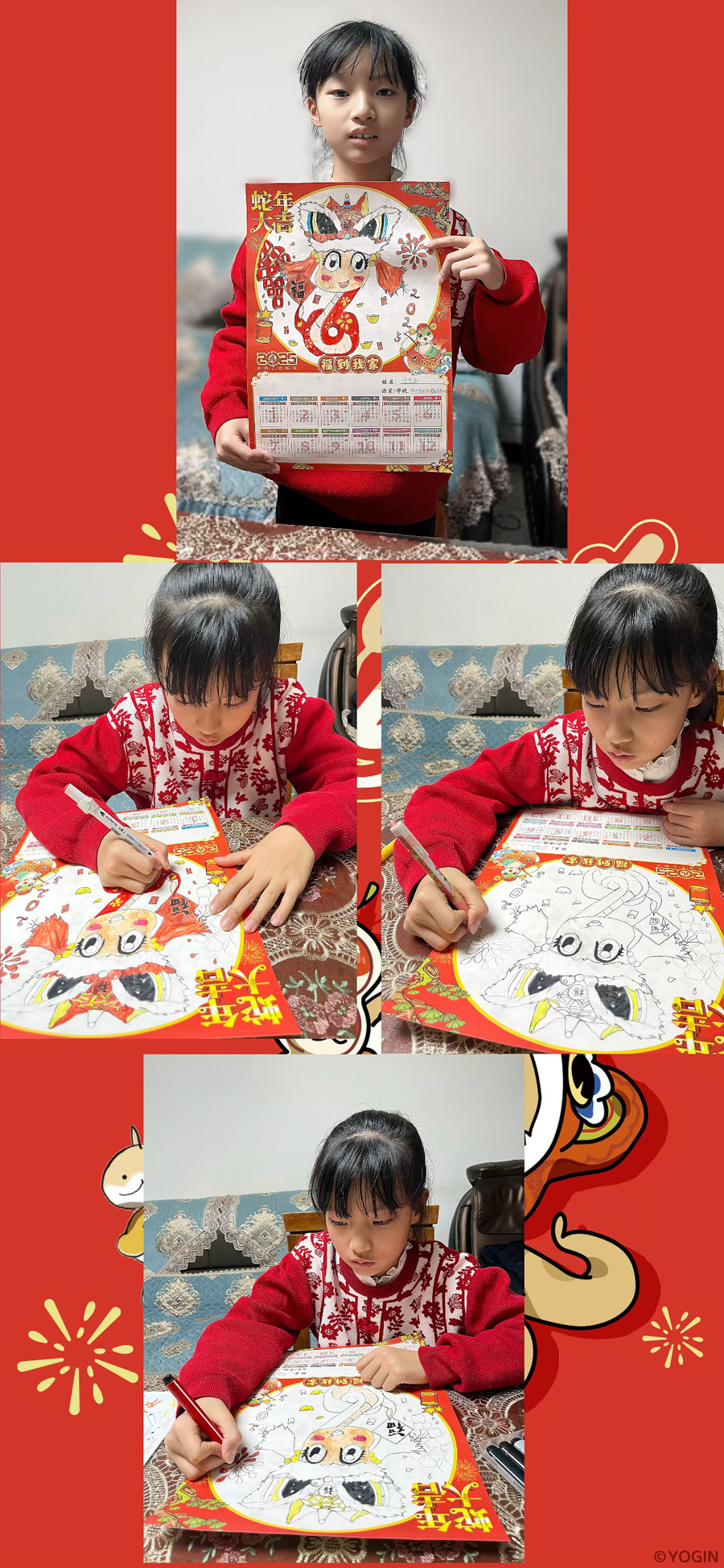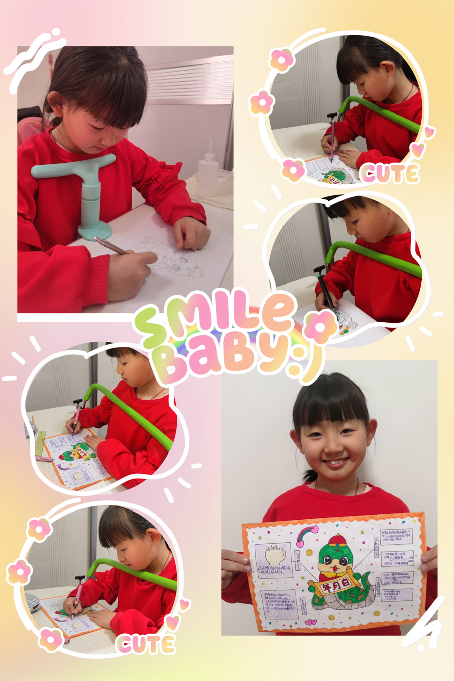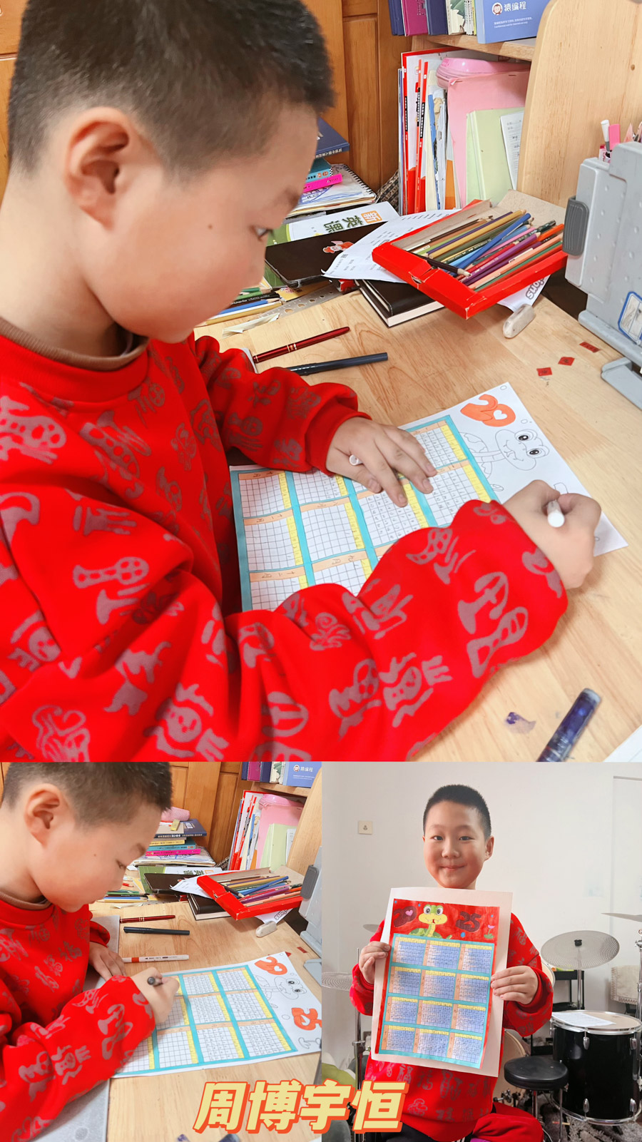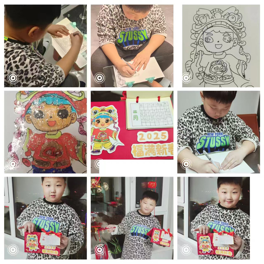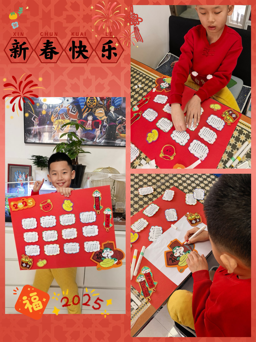 在做足准备工作后,孩子们运用了数学学习过的“年、月、日”和“日历中的规律”,应用了美术学科的构图,开始动手绘制蛇年日历啦!看,他们画得多认真啊!