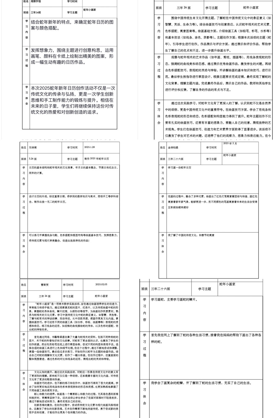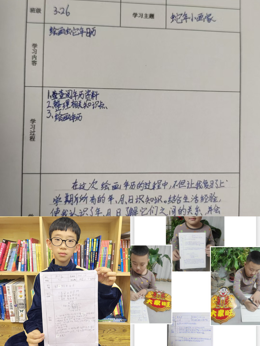 在上学期的学习中,我们认识学习了年月日,知道了一年中有12个月,分为大月和小月和二月,又学习了日历中的知识。新的一年来到了,我们是否可以用自己的画笔亲手制作蛇年的年历呢?带着这个问题,2022级26班的孩子们开展了“蛇年小画家”巧绘蛇年年历的综合实践活动。