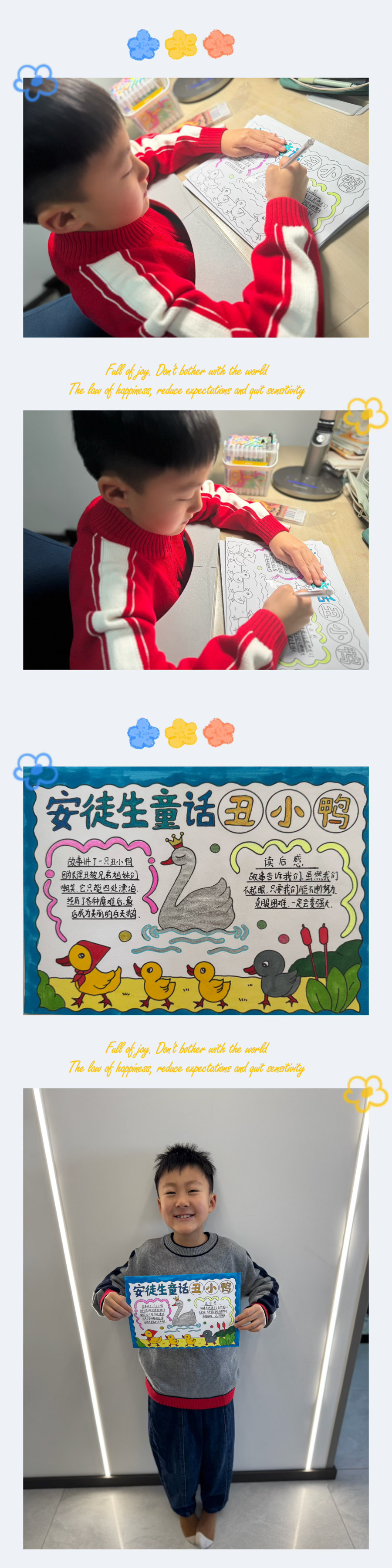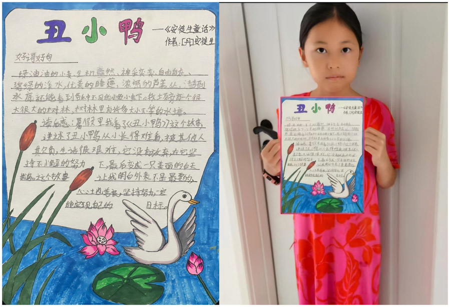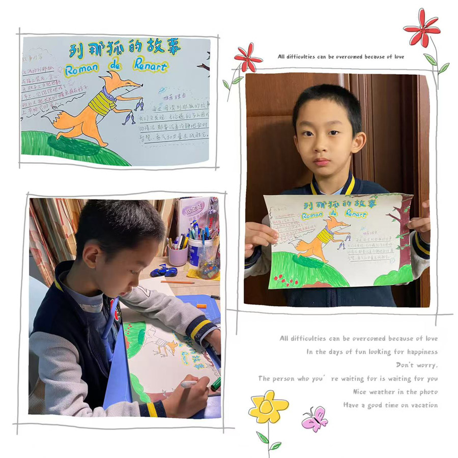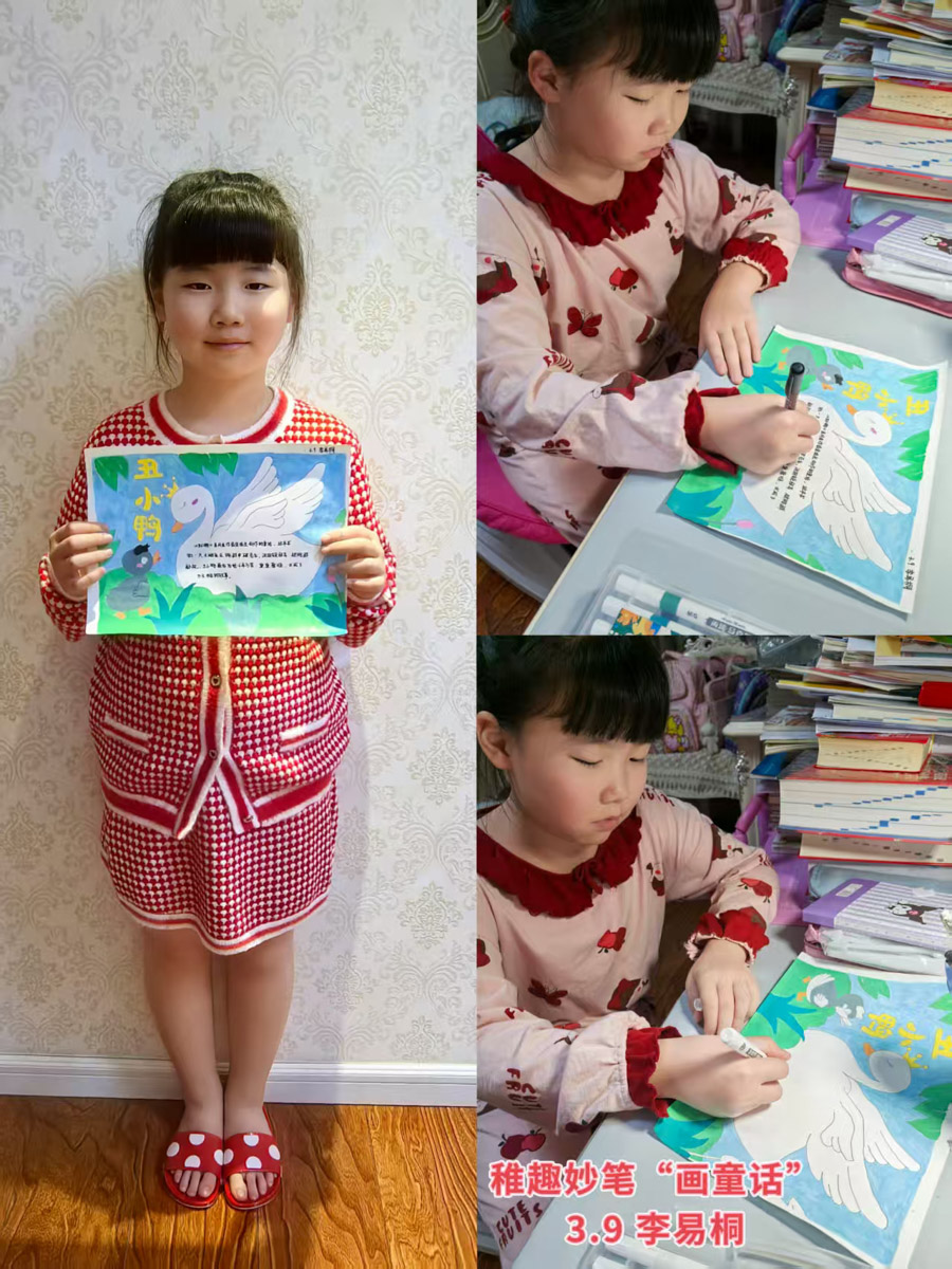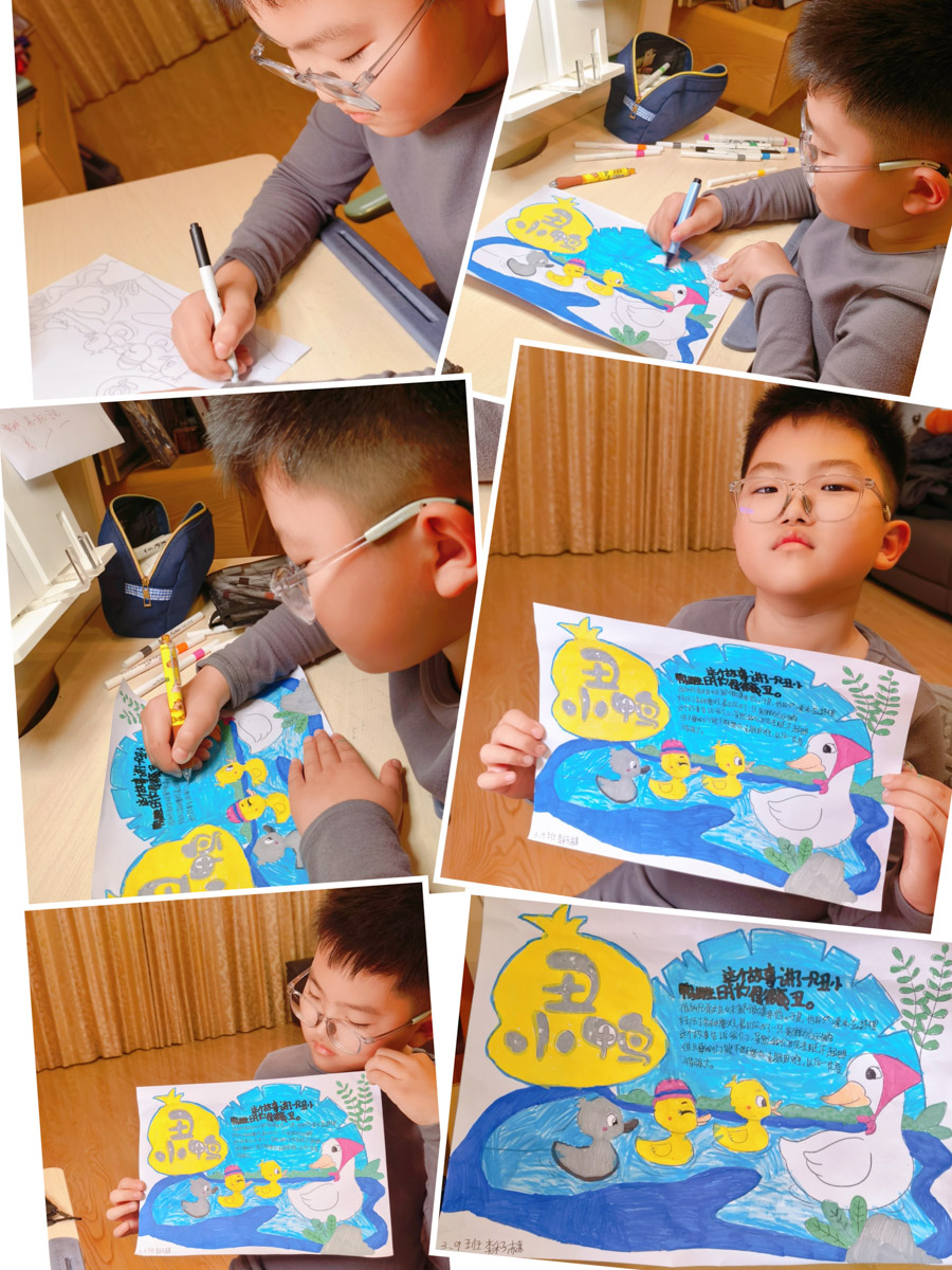 “一篇好童话胜过一百句教诲,一个好故事可以直抵孩子的内心”,孩子们在三年级上期学习了“童话单元”,而在童话中享受的又何止是他们,是他们和老师一起去经历了发现美的旅程。本次寒假语文综合实践活动,学生的创造性体现在利用阅读经验、绘画兴趣,结合语文、美术知识,通过绘画创作、故事展示、想象创编等,让学生深入童话的世界,探寻童话故事的魅力。学生在项目化学习过程中对于想象、理解、探究、合作、关注和选择童话知识有了更深的理解,提高了学生信息搜集、思维逻辑、阅读、绘画、写作、想象能力。在奇妙的童话世界中,一幅幅精美的画片,一行行活泼的文字,为大家带来了无尽的快乐与想象。未来让我们以书为伴,知深行远,勇敢追逐自己的梦想!