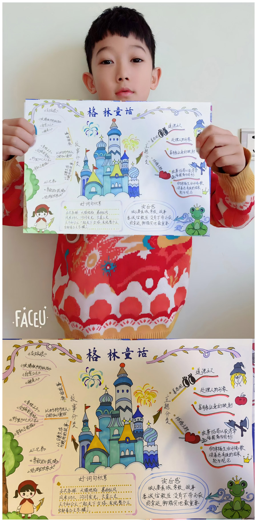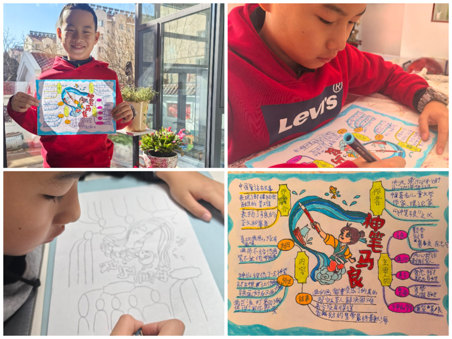 童话以其丰富的想象,曲折感人的故事情节和浅显易懂的语言深受孩子们的喜爱。为了使学生进一步感受童话的乐趣与特点,落实语文要素“感受童话丰富的想象”要求,深化学生对童话的学习,三年九班全体同学在寒假期间开展了《乘着想象的翅膀 游历童话王国》语文学科综合实践活动,同学们化身小小童话家,通过绘画、讲故事、思维导图等方式进行沉浸式童话学习体验,感悟故事中的真善美,提高了语言表达能力,激发了对童话的喜爱之情,同时在主动参与、乐于探究的过程中培养了想象能力、创造能力、表达能力。