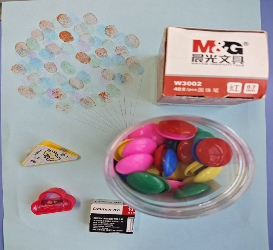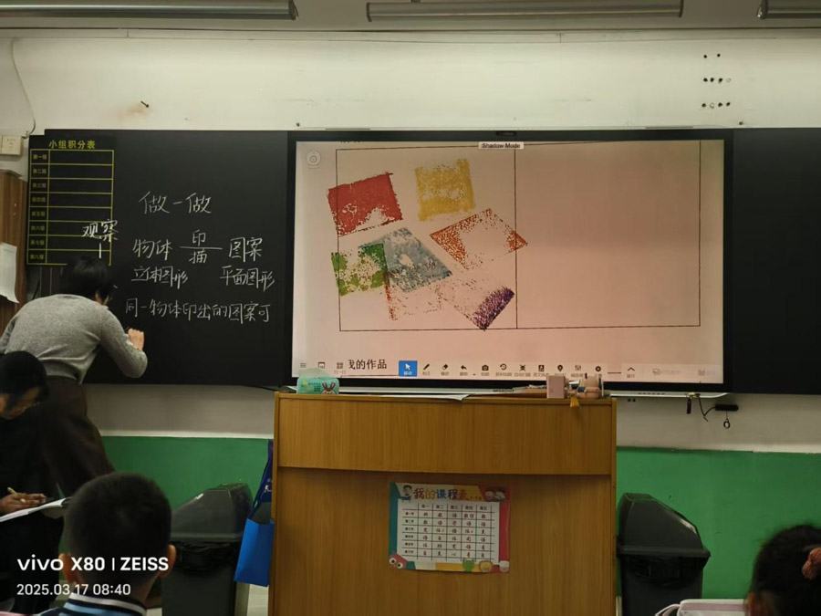 谈及教材重构意图,陈老师阐述:“将练一练的观察题转化为探究主线,目的是让‘观察-想象-验证'的思维过程可视化。当学生为云朵拓印失误争论时,他们对‘面'的理解反而比直接完成教材练习更深刻。”特别是订书钉盒与红笔盒的刻意对比,让孩子在争论‘哪个更适合印屋顶'时,自然领悟到观察方位的重要性。