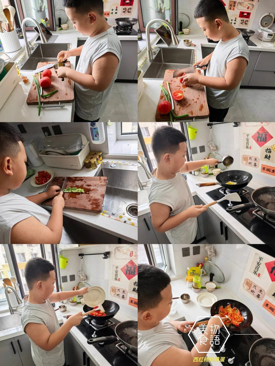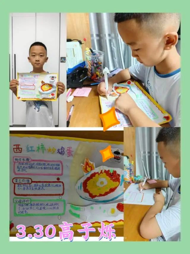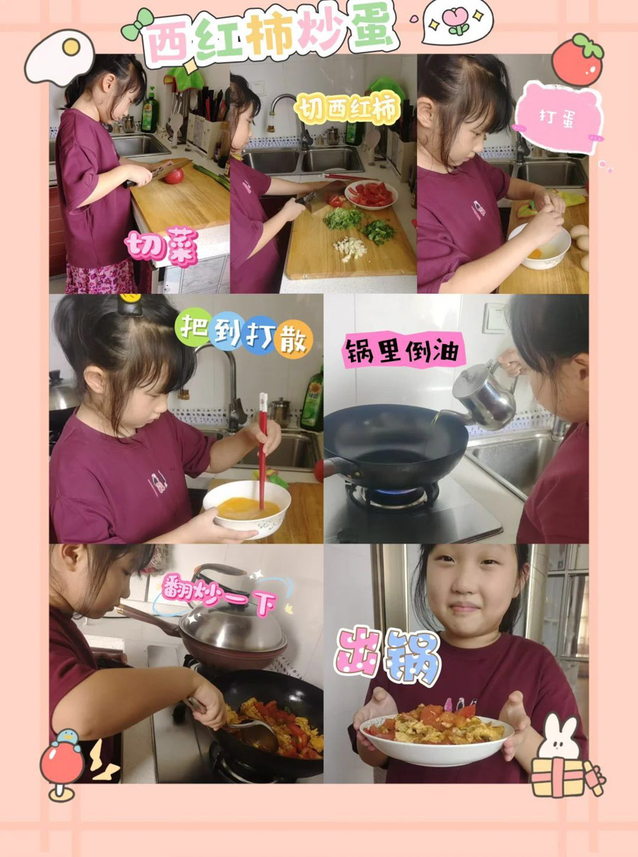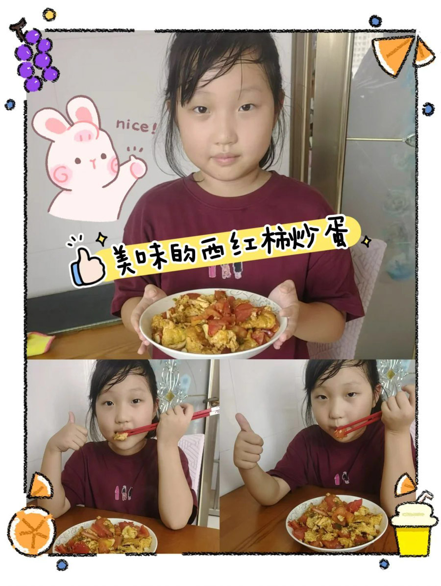 张家硕:今天我和妈妈一起做了香喷喷的**西红柿炒鸡蛋**!我负责洗红红的西红柿,把它们切成小块(妈妈帮我扶着)。我还打了鸡蛋,黄黄的蛋液在碗里跳舞,真好玩!妈妈教我开火、倒油,看着鸡蛋在锅里“滋啦”一声变成金黄色的蛋饼,我有点紧张又很兴奋。最后我们把西红柿倒进去一起炒,香味飘满了厨房!自己动手做的菜,吃起来感觉特别香,感觉自己像个小厨师一样厉害!