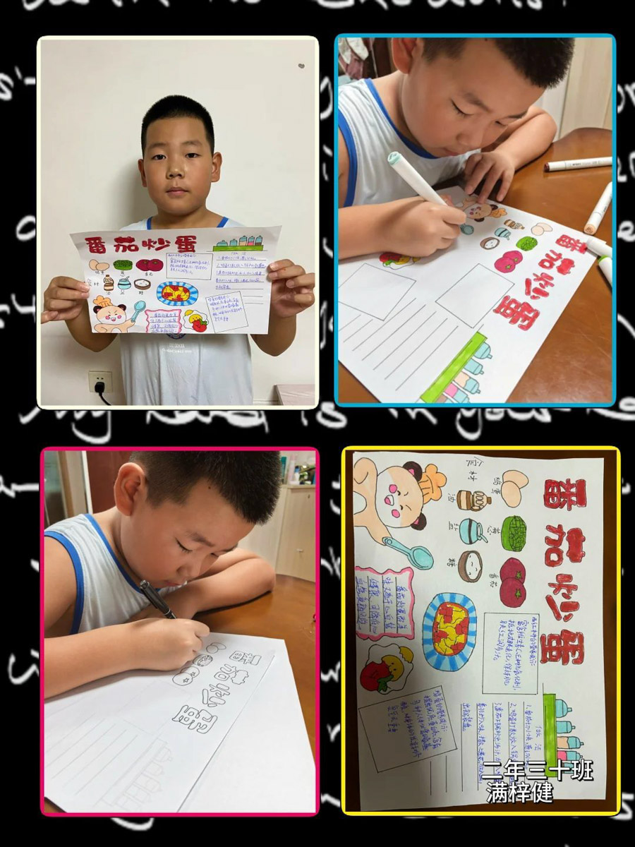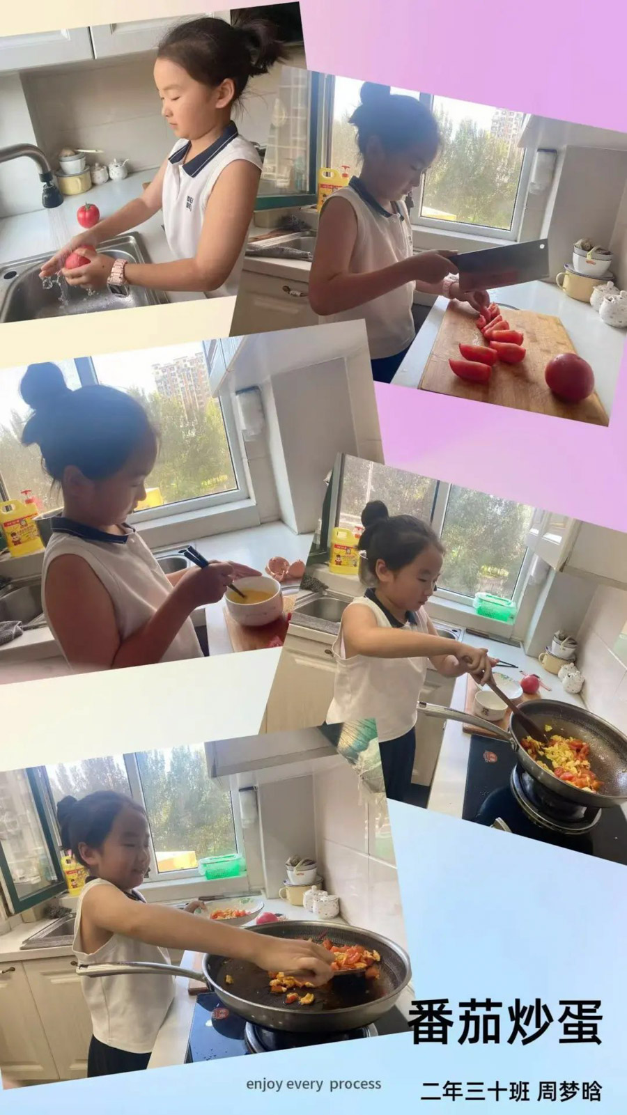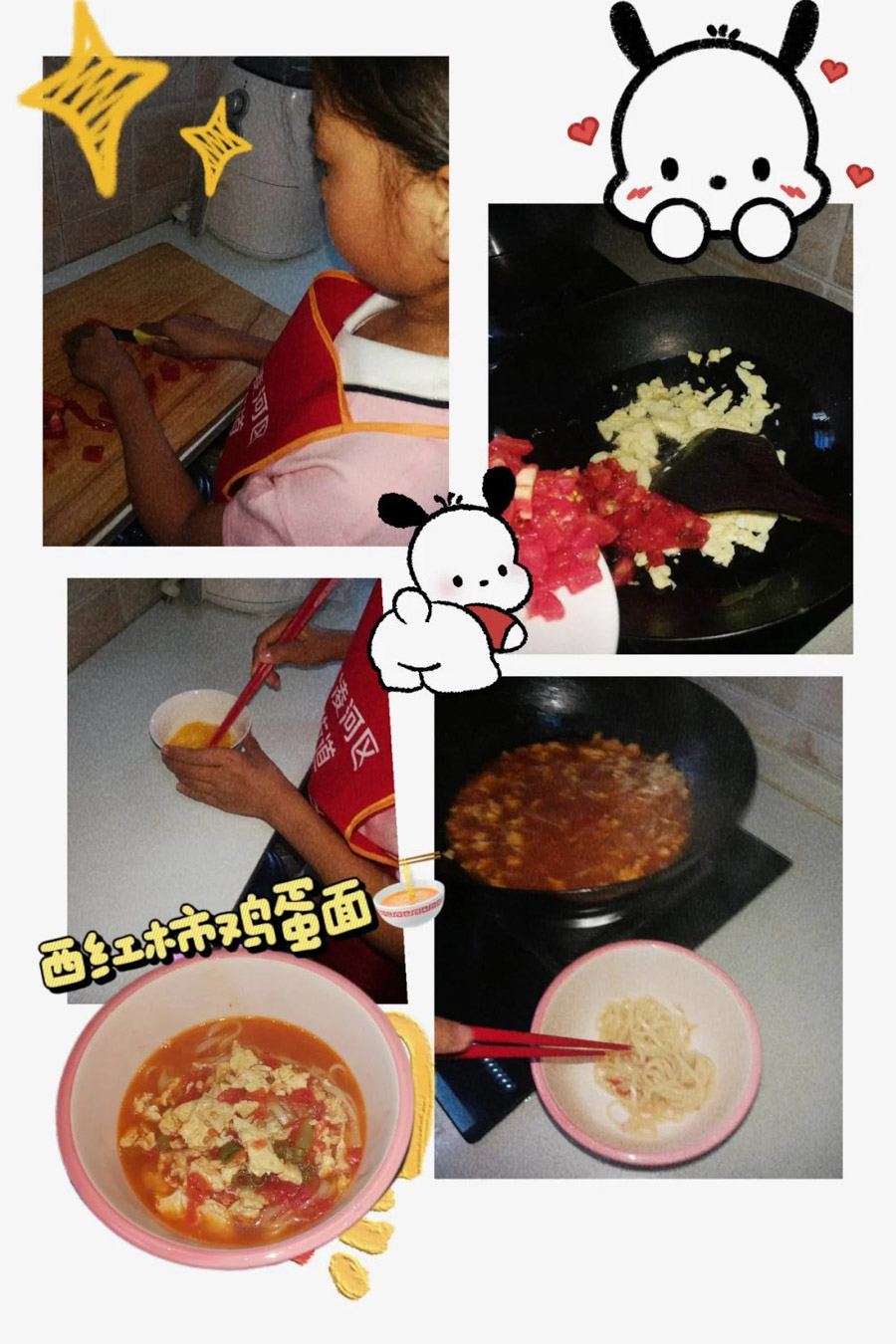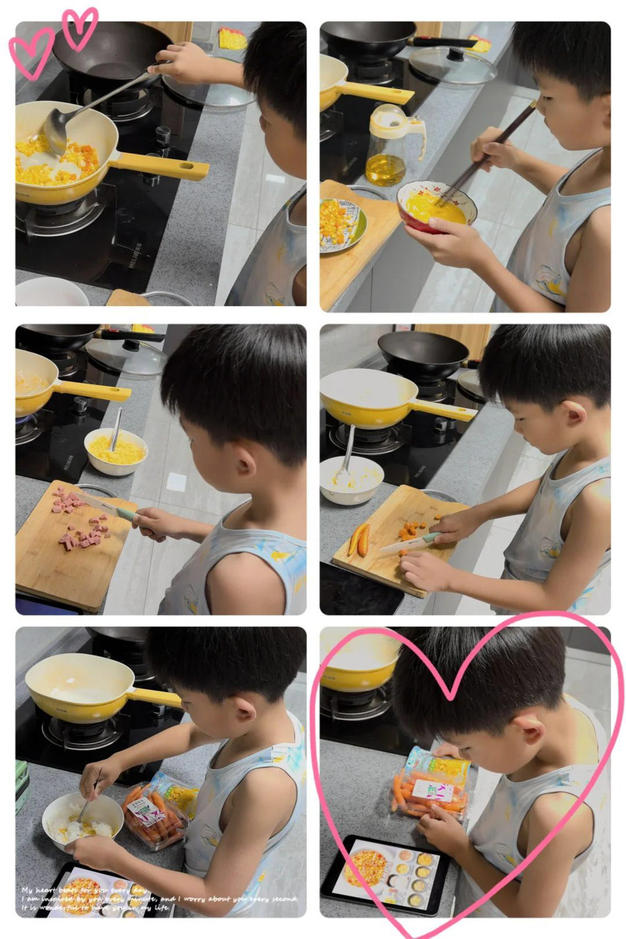张家硕:今天我和妈妈一起做了香喷喷的**西红柿炒鸡蛋**!我负责洗红红的西红柿,把它们切成小块(妈妈帮我扶着)。我还打了鸡蛋,黄黄的蛋液在碗里跳舞,真好玩!妈妈教我开火、倒油,看着鸡蛋在锅里“滋啦”一声变成金黄色的蛋饼,我有点紧张又很兴奋。最后我们把西红柿倒进去一起炒,香味飘满了厨房!自己动手做的菜,吃起来感觉特别香,感觉自己像个小厨师一样厉害!