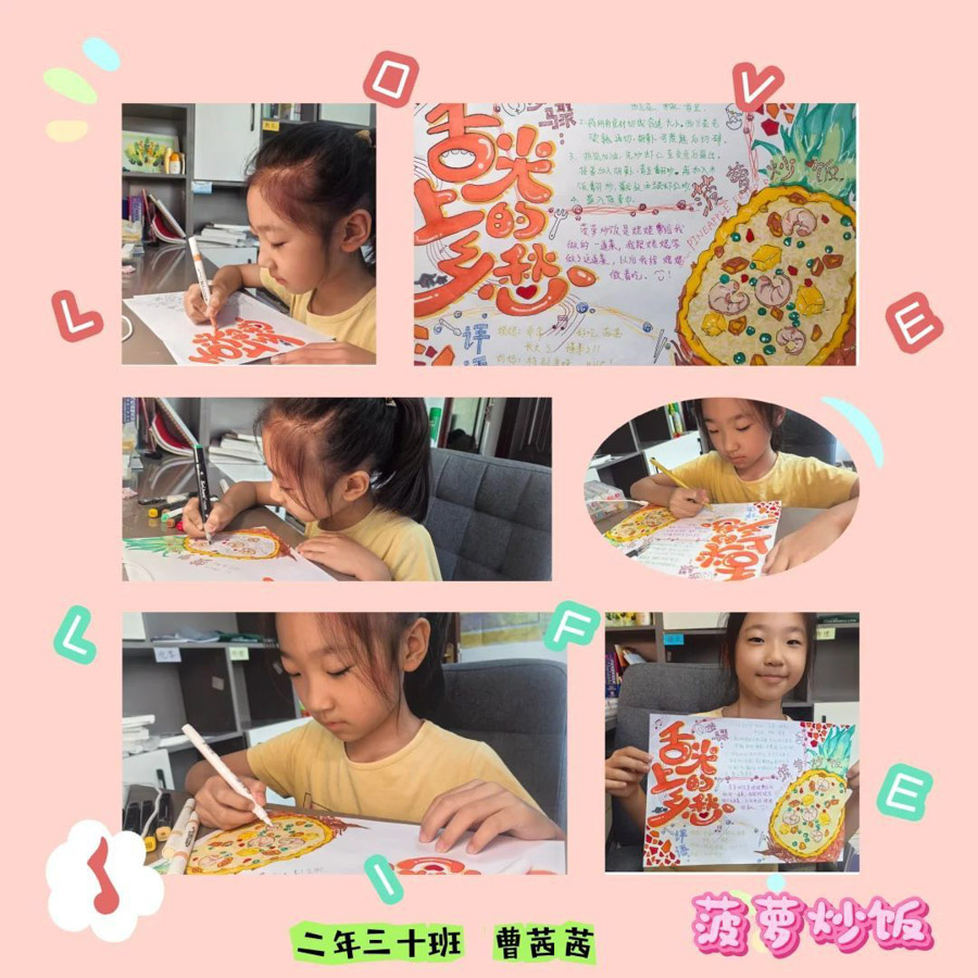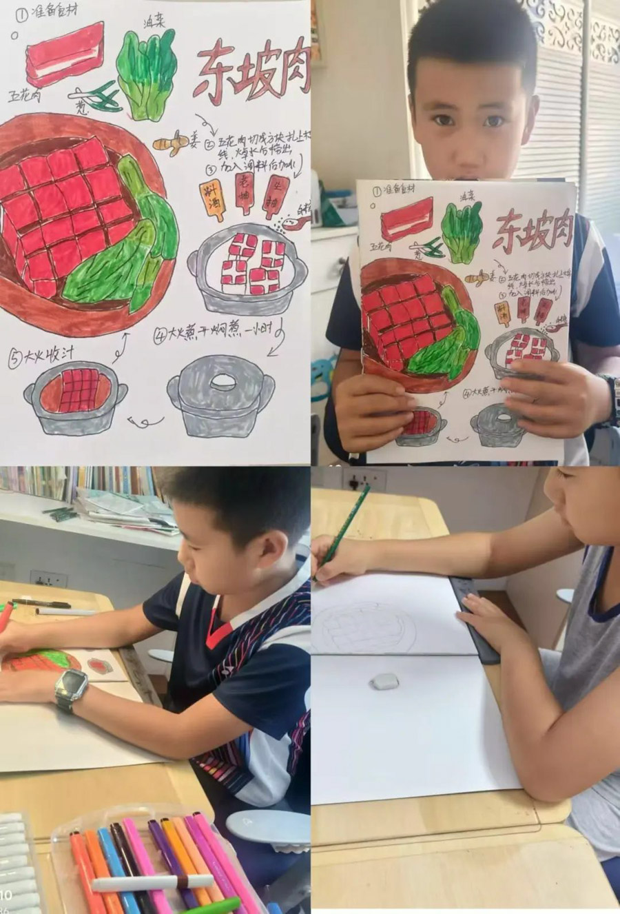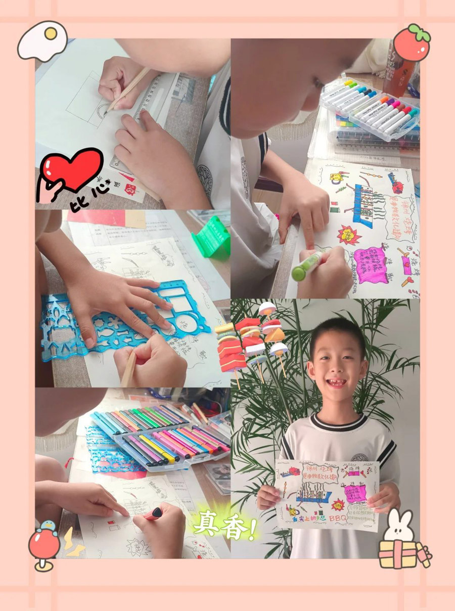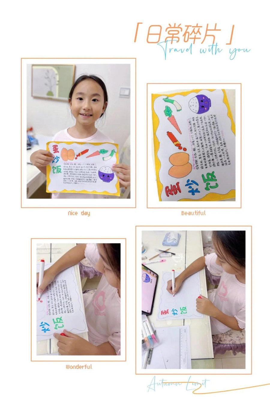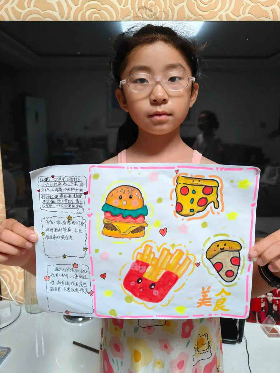 孩子们将自己对美食的理解用画笔画出来,以独特的视角和表达方式挥动手中的画笔,大胆构思,细细勾勒,认真上色。一张张精美的美食小报,图文并茂,让孩子们认识了家乡博大精深的美食文化,体验制作美食的过程,享受创造美食的快乐,进而发现生活的美好。