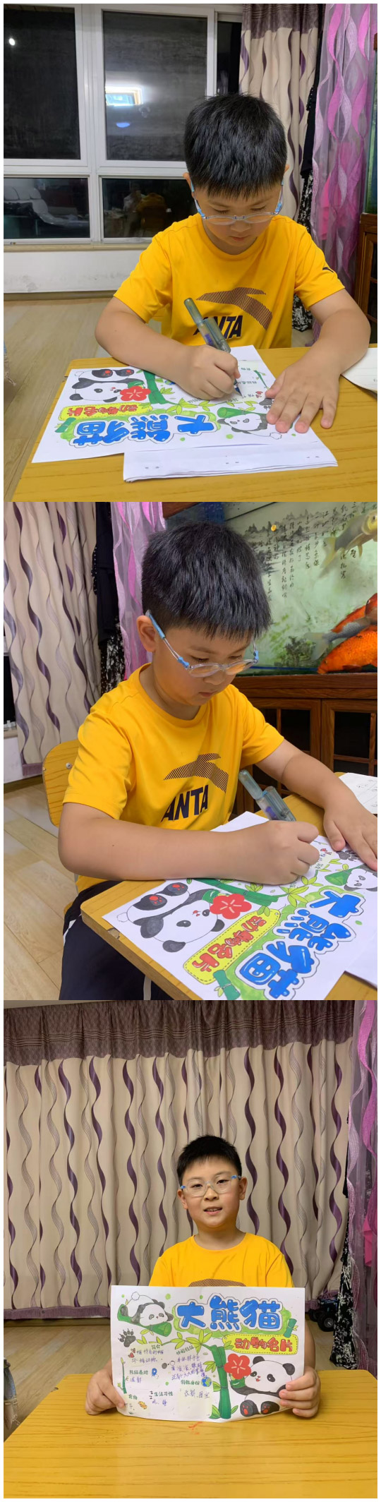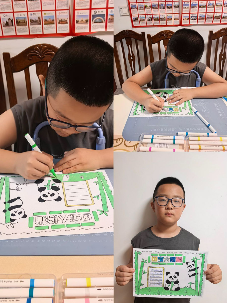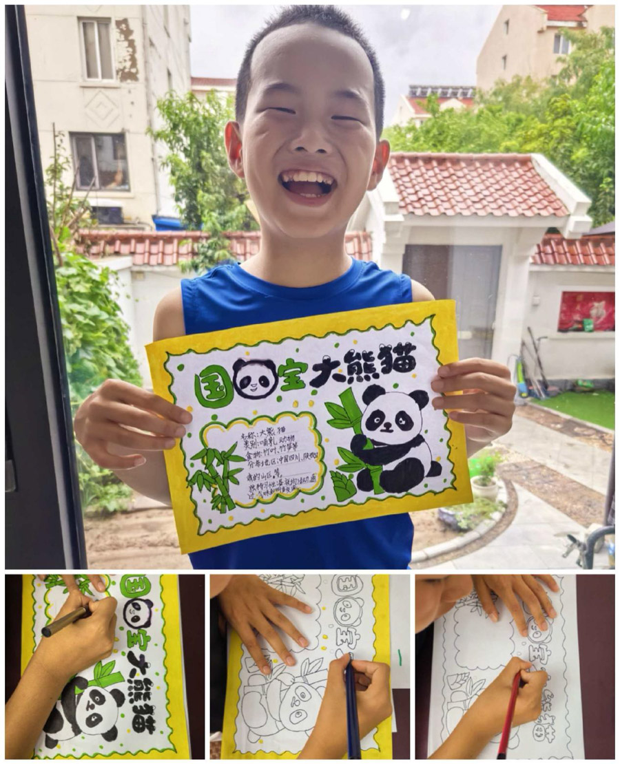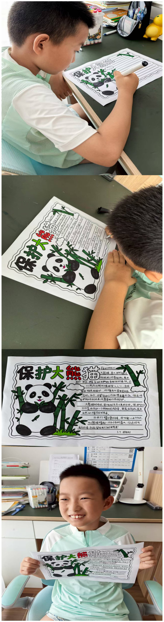 看着孩子积极参与这次熊猫主题实践活动,作为家长,我感到特别欣慰。活动刚开始时,孩子对熊猫的了解还很有限,只是觉得熊猫很可爱。但为了完成手抄报,他主动去查阅资料,了解熊猫的生活习性、分布地区等知识,还会和我们讨论哪些内容更适合放在手抄报上;在准备 “小小讲解员” 的讲述内容时,一遍遍地练习,从一开始的紧张忘词,到后来能流利地讲述熊猫的故事,这个过程中他的表达能力和自信心都有了明显的提升;让我惊喜的是,孩子在活动中学会了主动思考和解决问题,比如制作手工熊猫遇到困难时,他没有放弃,而是想办法克服。这次活动不仅让孩子学到了知识,还培养了他的多种能力,这样的实践活动真的很有意义。
