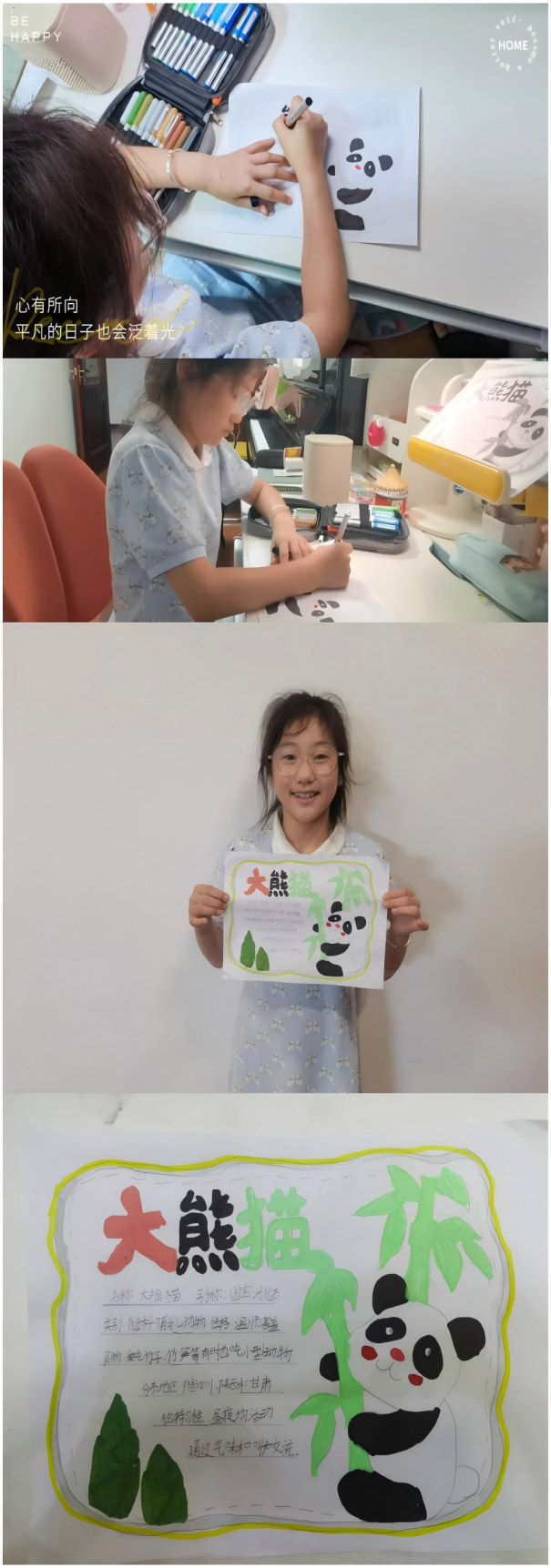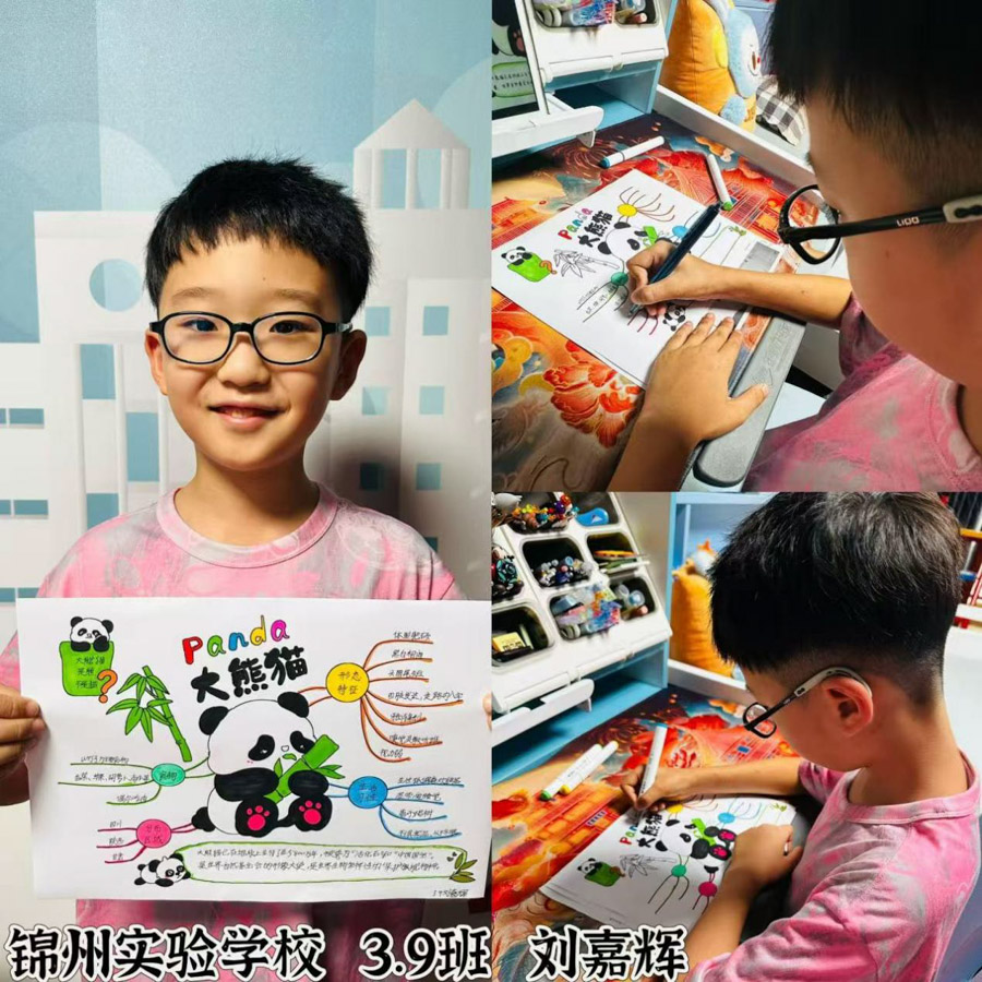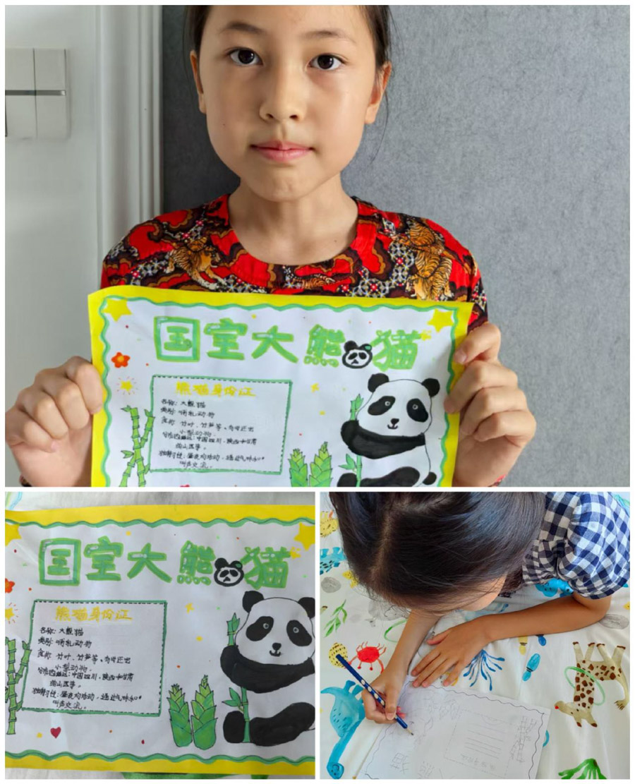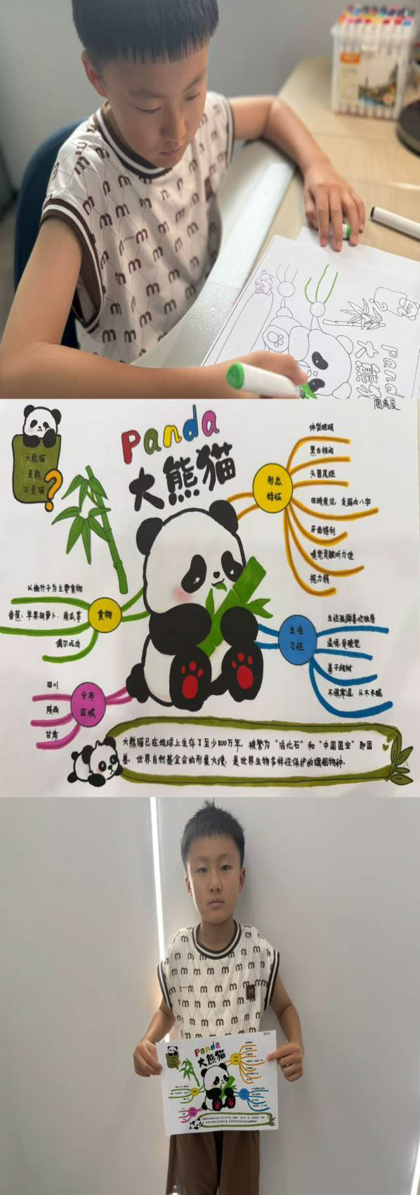 孩子们通过手抄报、思维导图等形式,将观察到的熊猫外形特征、生活习性等细细梳理。在手抄报上绘制熊猫憨态、书写趣味知识,让图文交织成鲜活的熊猫档案;用思维导图梳理熊猫与竹林的关联、国宝的保护意义,让零散的发现串联成清晰的认知脉络,让笔尖流淌的不仅是文字,更是探索熊猫世界的满满收获。