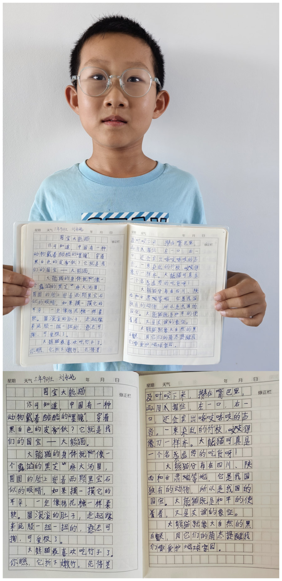 用文字来描绘熊猫的世界吧!以熊猫的视角写一篇自我介绍(小作文)展现熊猫视角下的日常点滴,如分享啃竹时的满足、打滚时的快乐等外形特征、生活习性、分布地区、行为性情;通过硬笔书法的形式书写描写熊猫的美好诗词或是佳句,将对熊猫的喜爱融入笔端,让书法作品既展现文字的美感,又传递出熊猫的独特风采。