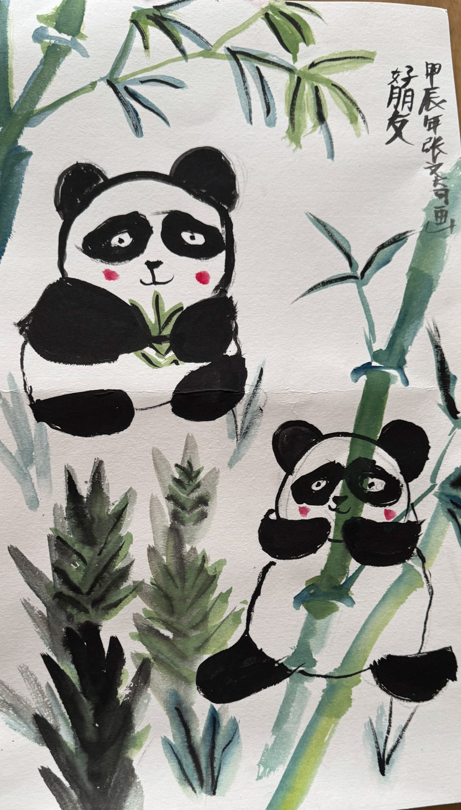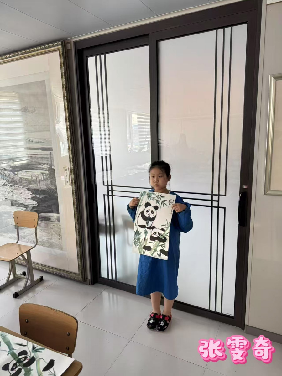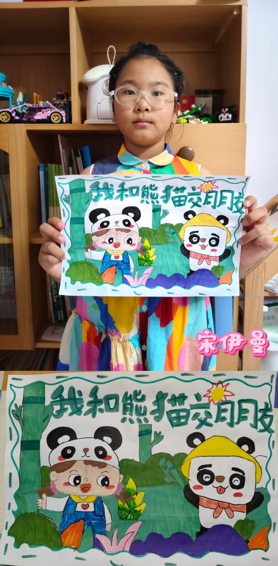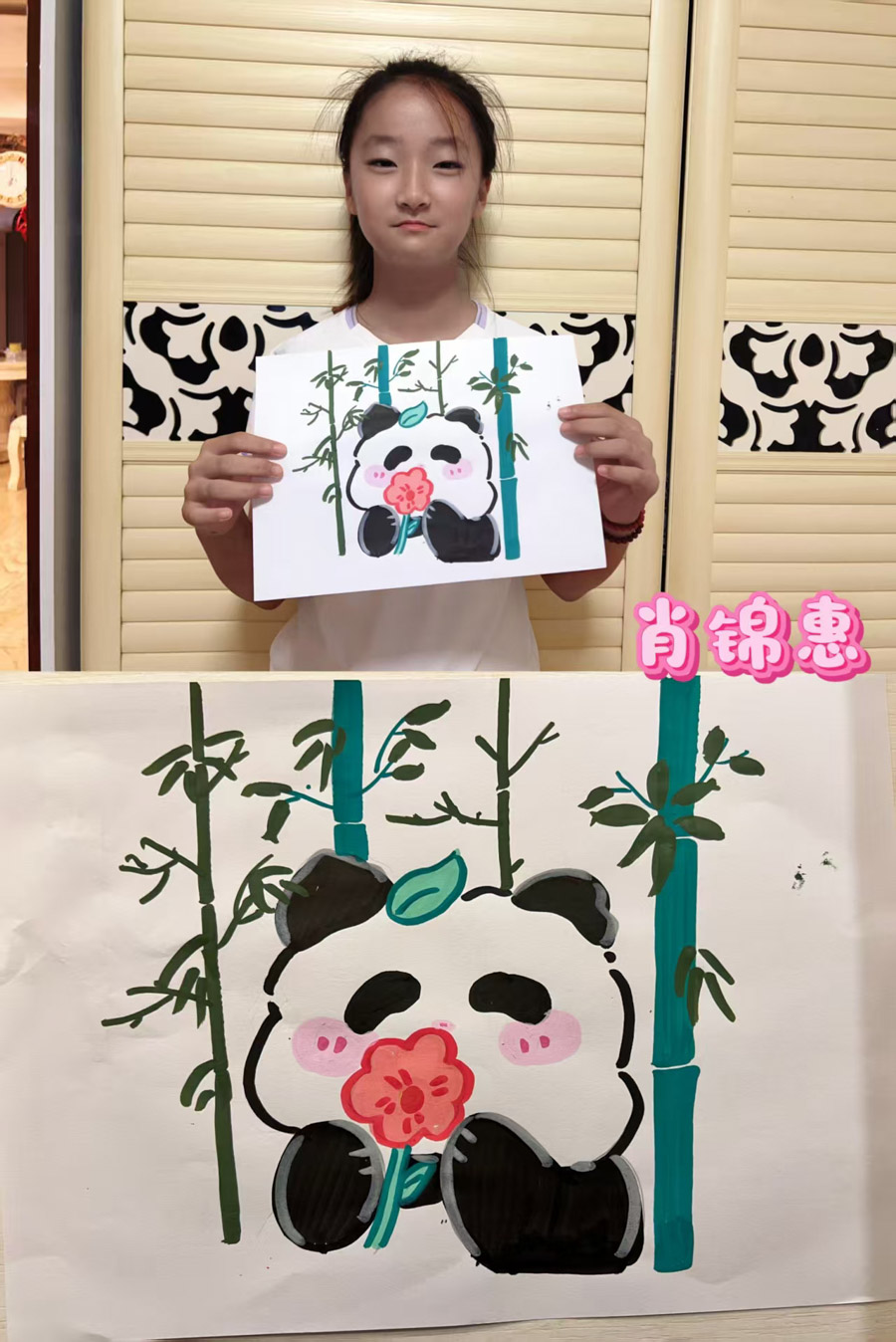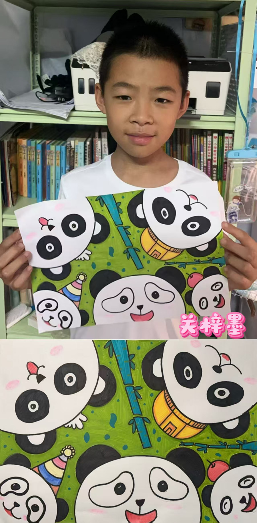 当铅笔在纸上沙沙游走,当颜料在画布上晕染开黑白的温柔,每一个线条里都藏着一个心愿——想和圆滚滚的大熊猫,说上一句悄悄话,牵起一次小手。在《我和熊猫交朋友》的绘画里,没有标准答案,只有孩子们用色彩和想象搭建的“友谊桥梁”,每一笔都是最真诚的“见面礼”。让我们来看看学生们的成果吧:
