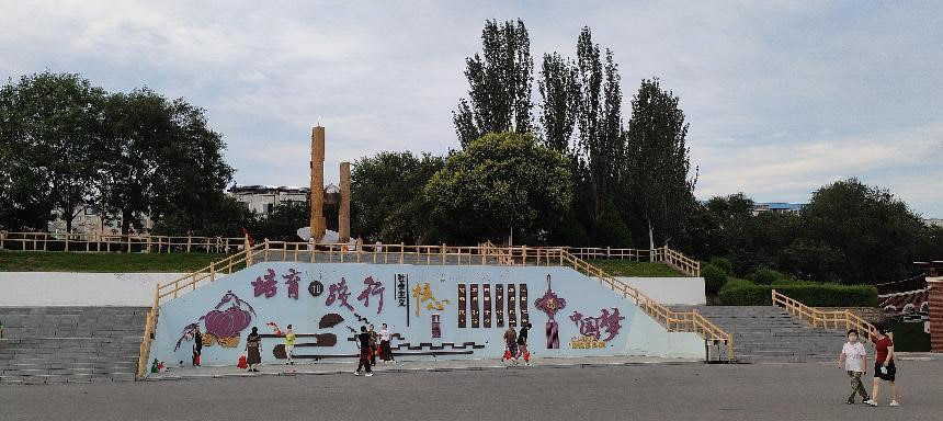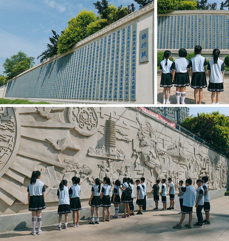 整体艺术浮雕墙由毕业于天津美术学院的青年雕塑家李畅设计制作,从东至西,为从远古到现代的表现顺序。东侧浮雕墙书“锦绣”,西侧浮雕墙书“之州”,两侧浮雕合起是一幅完整的“锦绣之州”立体画面!整组浮雕墙象征拉开的帷幕,寓意全市广大党员干部群众一道,正以饱满的热情积极投入到全面落实市第十二次党代会确定的目标任务中,努力把实现锦州全面振兴的宏伟大业推向前进。