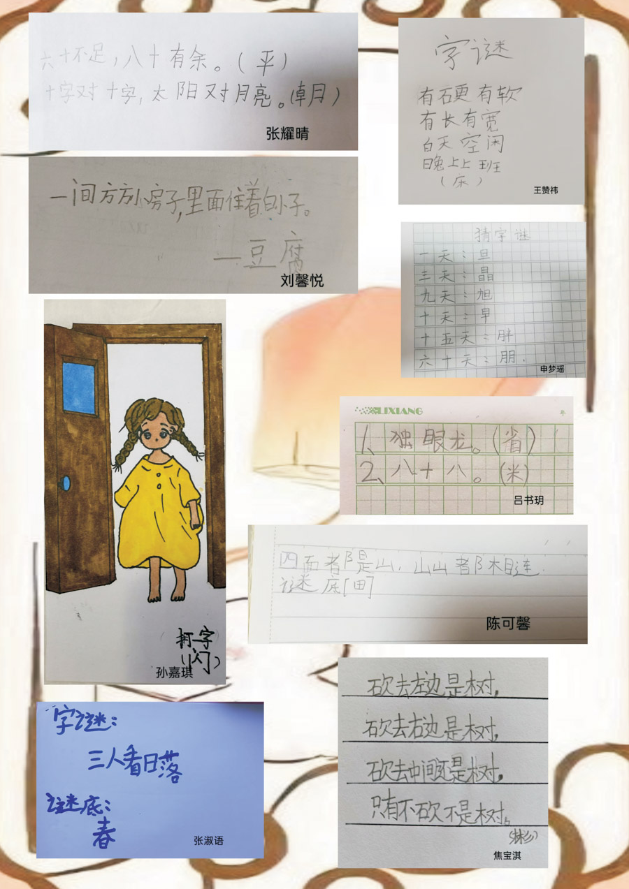 沈浚禾同学:“猜字谜太有意思啦!活动前,我从图书、网络还有爸爸妈妈那里,知道了字谜历史可悠久了,从很久很久以前就有,大家用它来娱乐、交流 。活动时,我出的字谜难住了好多同学,心里别提多得意。猜别人的字谜时,我绞尽脑汁,也学到了好多生字。我喜欢这样的活动!”