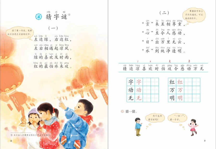 将一下语文书翻开至第8、9页。复习书上呈现的第一则字谜“秋”和第二则字谜“请、情、晴、清”。根据以上汉字的特点,掌握简单字谜规律:组合式字谜、象形式字谜、会意字字谜等。