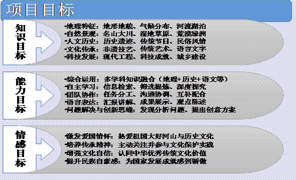 按照锦州市实验学校暑假项目化学习要求,为响应学校跨学科项目化学习倡议,2020级8班开展了以“游遍中国”为主题的项目化学习。此次活动旨在培养学生综合素养,引导同学们跳出书本局限,深入了解祖国的多元文化、壮丽山河与丰富历史。项目目标: