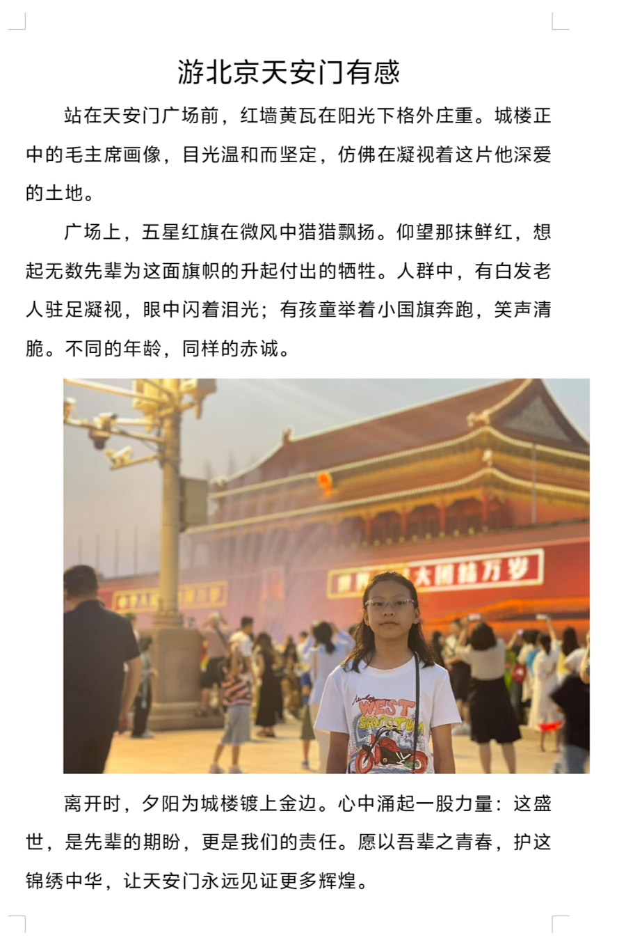 这场“游遍中国”项目化学习,恰似一扇洞见世界的窗,为同学们的成长轨迹烙下了鲜明深刻的印记,期待同学们携着这份对世界的好奇与热爱,在往后的岁月里步履不停,在生活的肌理中发现新知,在时代的潮汐中汲取力量,让每一成长都成为对“游遍中国”最美的延续。