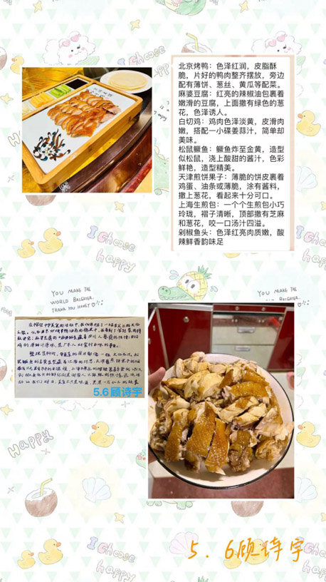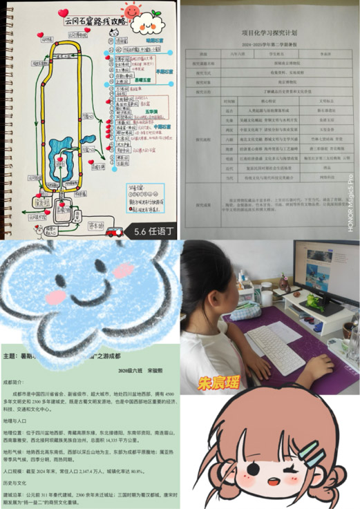 本次跨学科项目化活动中,学生整体表现积极出色,充分展现了自主探究与实践能力。学生们能根据主题主动规划学习路径,或实地考察,或利用线上资源进行深度学习。在信息收集、整理记录(摄影、绘画、笔记)环节,学生展现出良好的信息素养和创造力。最终成果形式多样、内容丰富,不仅清晰呈现了地域特色与文化内涵,更体现了学生对知识的内化与个性化表达。活动过程中,学生普遍表现出浓厚的兴趣和强烈的参与感。尤为可贵的是,通过亲身体验或沉浸式学习,学生对中国多元文化的认同感和民族自豪感显著增强,项目目标有效达成。整体而言,学生高质量地完成了项目任务,实践成果丰硕,综合素养得到切实锻炼。