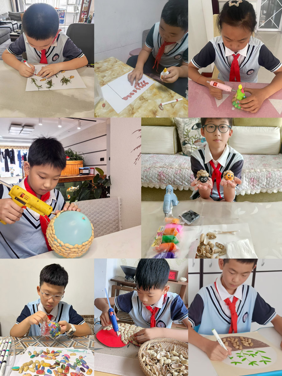 在制作过程中,我们也遇到了一些问题。在向爸爸妈妈及同学们请教之后,我们开动脑筋,想出了很多解决的办法。最后,看看我们的艺术成果——花生壳儿美美的!