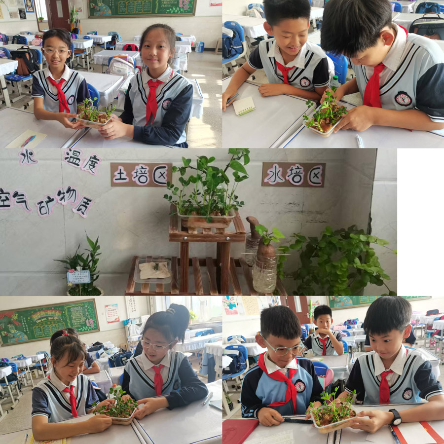 花生在我们的照料下茁壮成长着。为了让它们生长得更好,有人把花生栽植到土壤中,让它们获得更多的养分,有的同学则继续水培着……