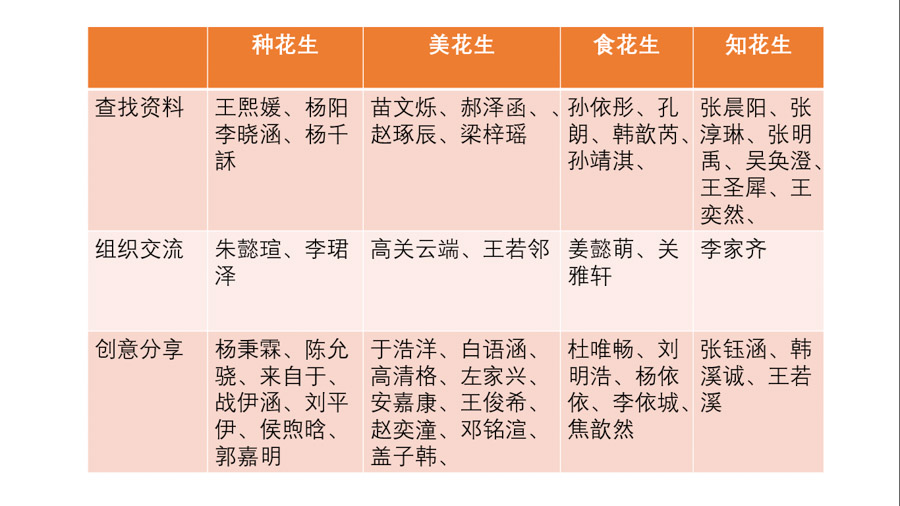 围绕“花生”,同学们集思广益,提出了种花生、美花生、食花生、知花生四个探索的方向。
