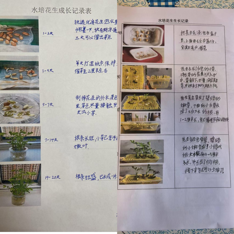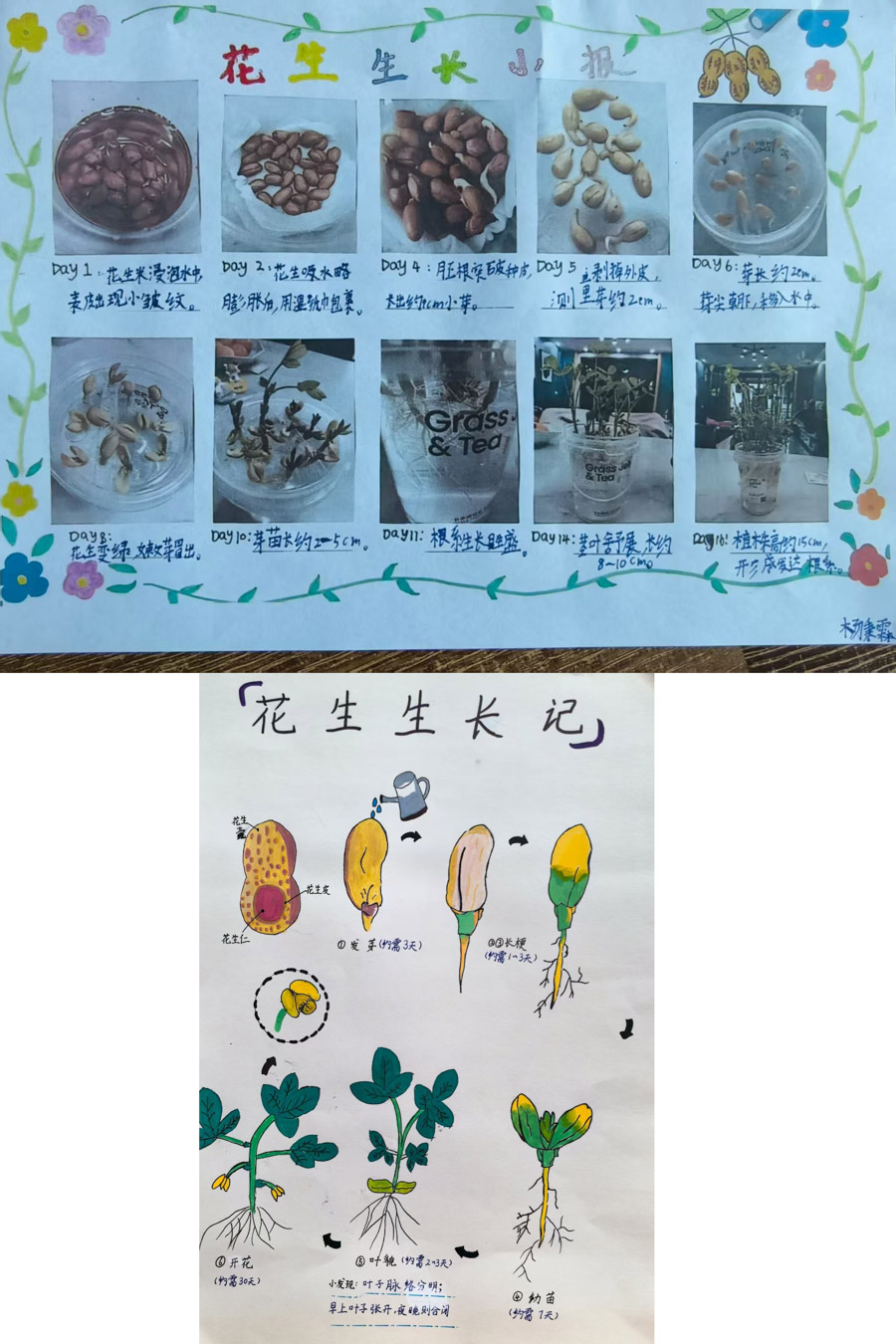 为了观察和研究,我们利用数学课上学到的统计与测量的方法进行数据积累,利用美术知识绘制简单的花生生长状态,还有的同学用手机和电脑,制作了花生生长日记。看看我的观察记录吧。