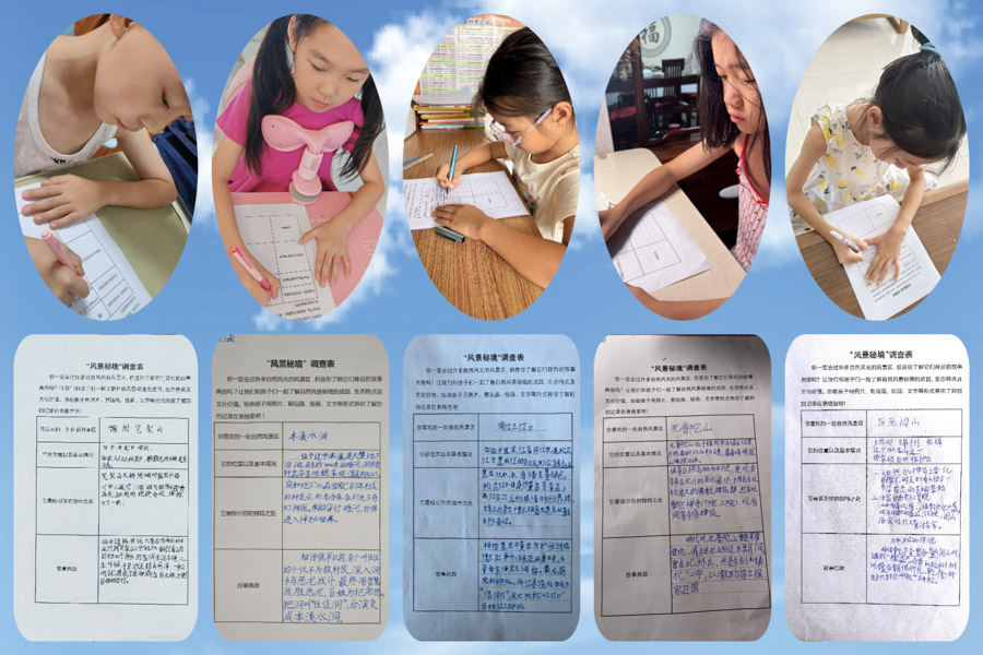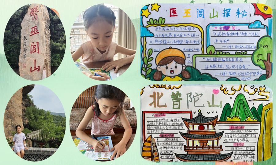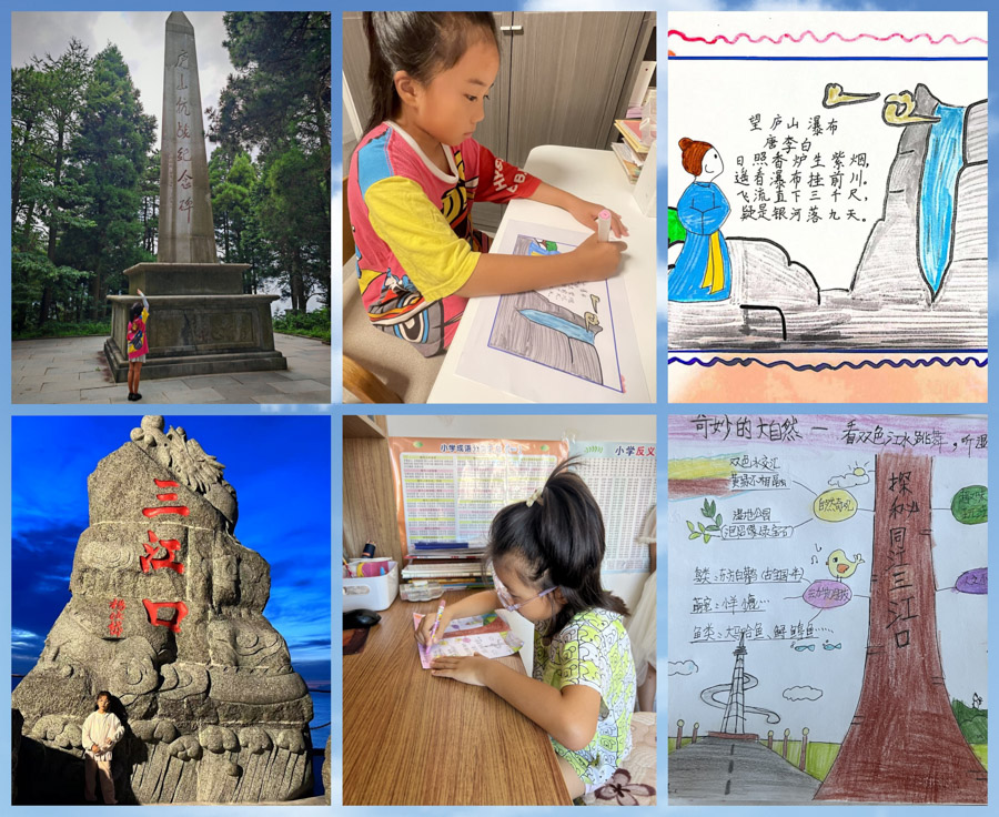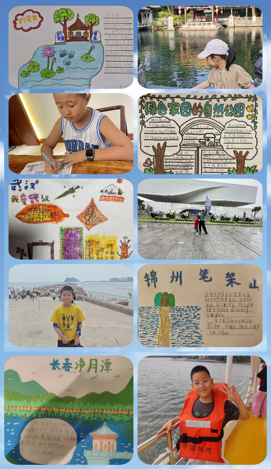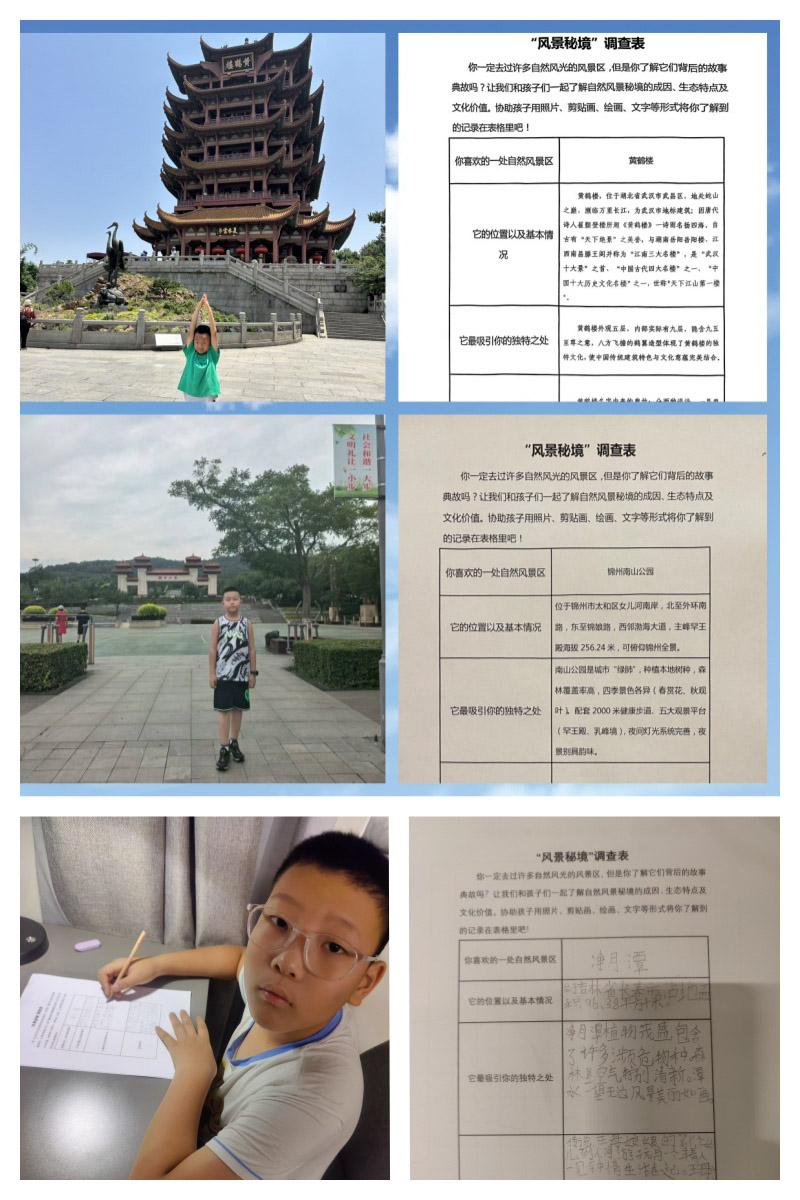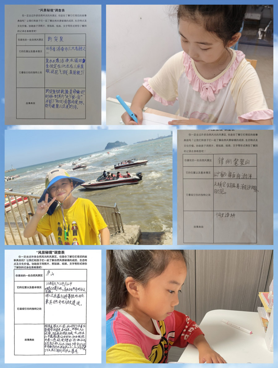 也有同学欣赏分析山川、河流等自然景观的形成过程和地理特征。共有11位同学参加,在家长的带领下同学们分别探究了9处自然景观,其中包括笔架山、趵突泉、庐山、本溪水洞、医巫闾山、黄鹤楼、净月潭、同江、南山。对它们的位置、独特之处,以及背景故事等进行了详细地研究。